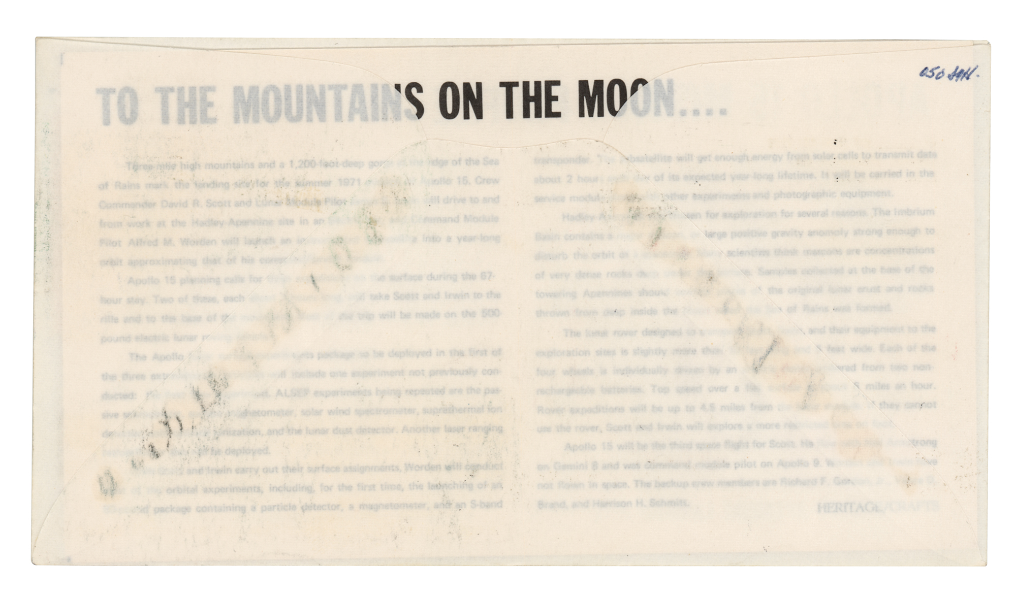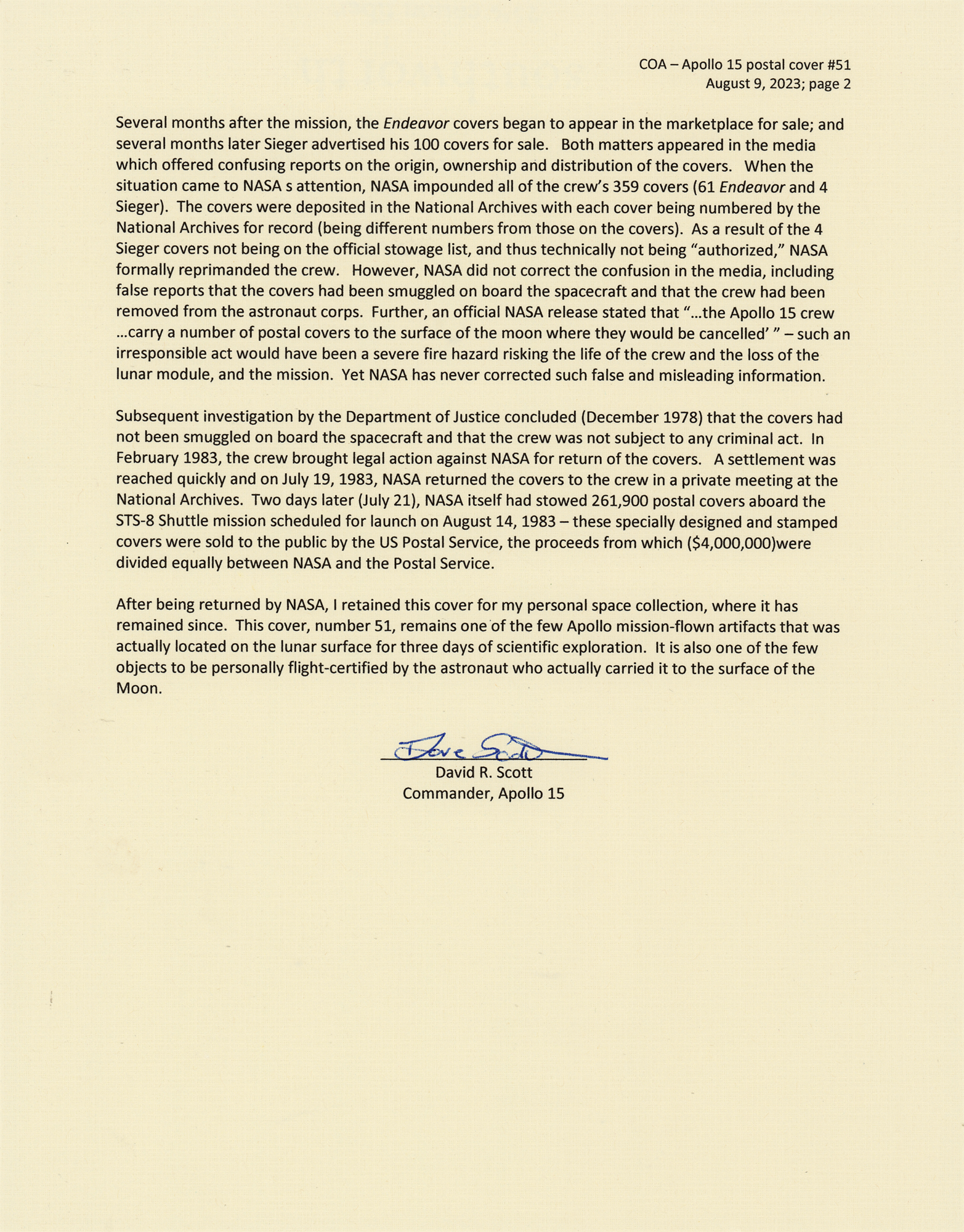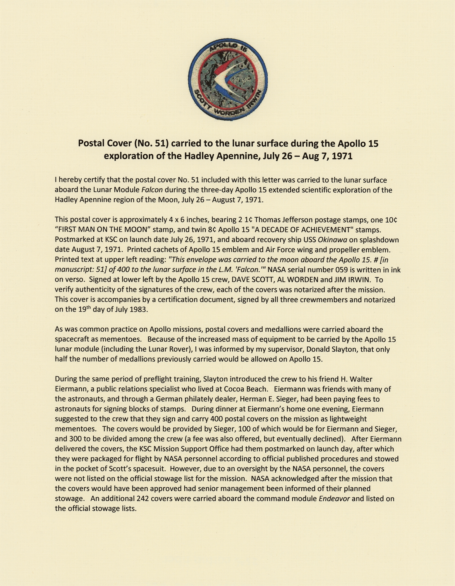 Accompanied by a lengthy signed letter of provenance from Cdr. Scott, which reads, in part: “I hereby certify that the post cover No. 51 included with this letter was carried to the lunar surface aboard the Lunar Module Falcon during the three-day Apollo 15 extended scientific exploration of the Hadley Apennine region of the Moon, July 26–August 7, 1971…As was common practice on Apollo missions, postal covers and medallions were carried aboard the spacecraft as mementoes. Because of the increased mass of equipment to be carried by the Apollo 15 lunar module (including the Lunar Rover), I was informed by my supervisor, Donald Slayton, that only half the number of medallions previously carried would be allowed on Apollo 15.