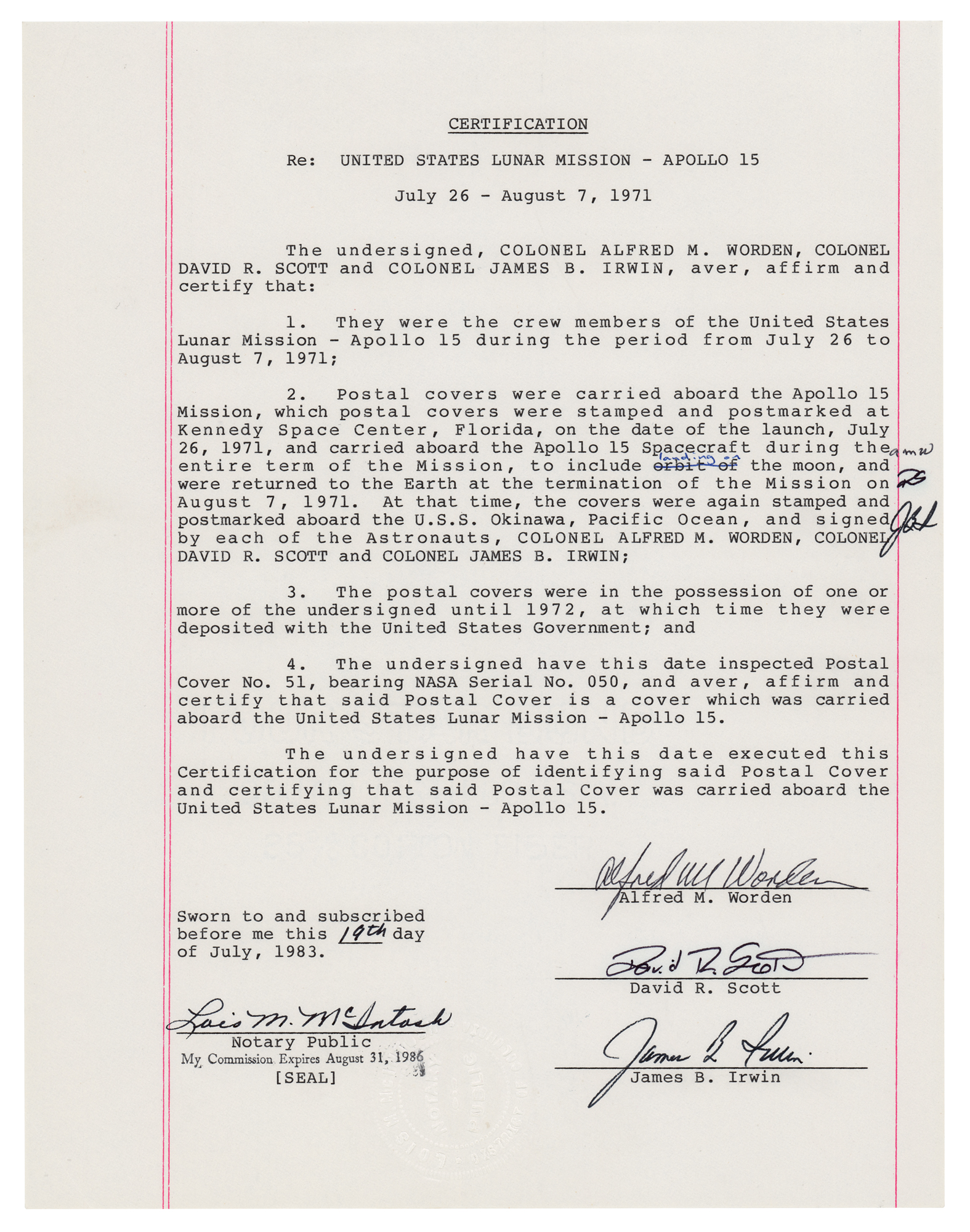 Included with the cover is a one-page typed notarized certification, signed “Alfred M. Worden,” “David R. Scott,” and “James B. Irwin,” dated July 19, 1983, reading, in part: “Postal covers were carried aboard the Apollo 15 Mission, which postal covers were stamped and postmarked at Kennedy Space Center, Florida, on the date of the launch, July 26, 1971, and carried aboard the Apollo 15 Spacecraft during the entire term of the Mission, to include landing on the moon, and were returned to the Earth at the termination of the Mission on August 7, 1971…The postal covers were in the possession of one or more of the undersigned until 1972, at which time they were deposited with the United States Government…The undersigned have this date inspected Postal Cover No. 51, bearing NASA Serial No. 050, and aver, affirm and certify that said Postal Cover is a cover which was carried aboard the United States Lunar Mission—Apollo 15.” All three crew members have also added their initials to a small correction in the text. In fine condition.