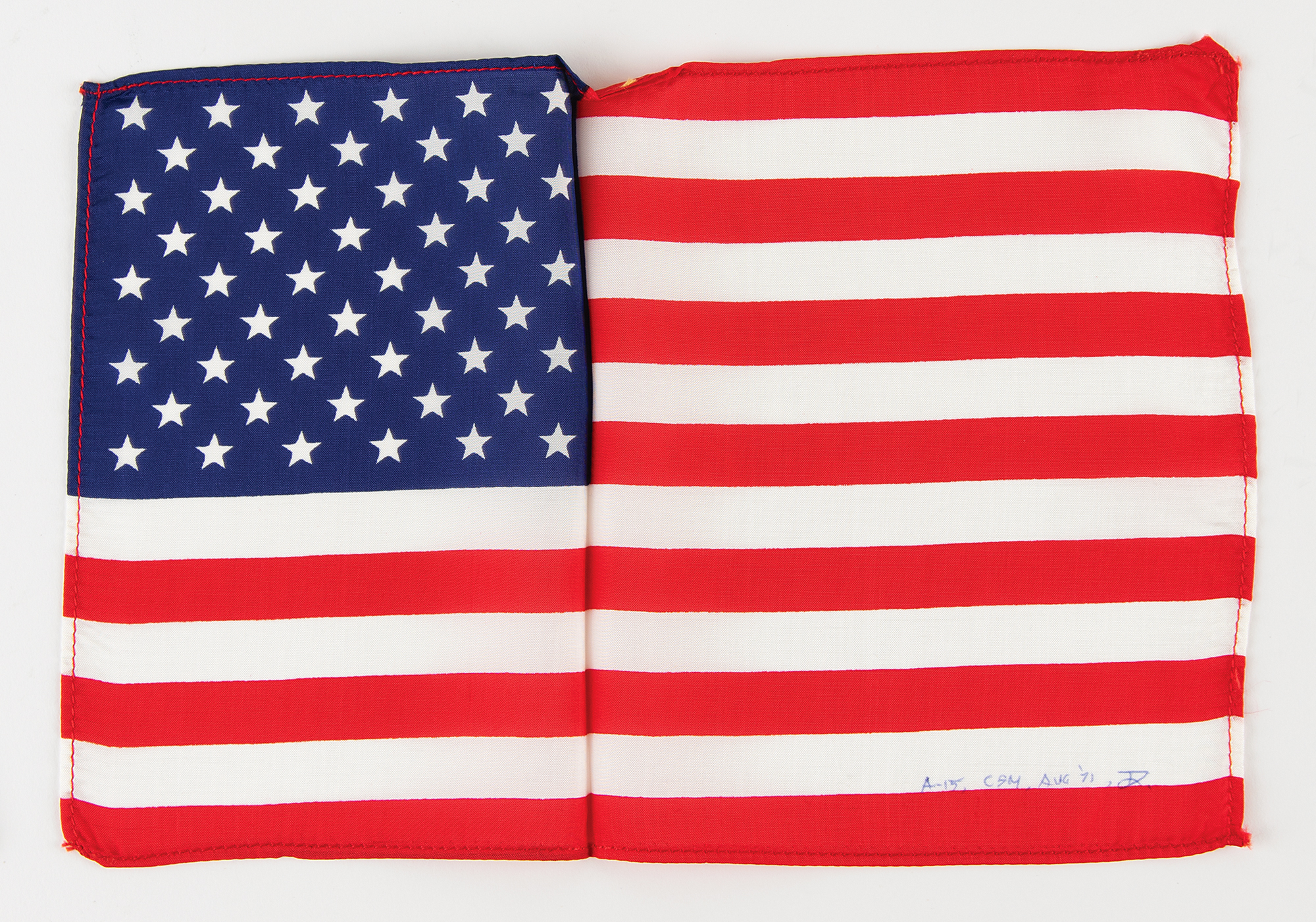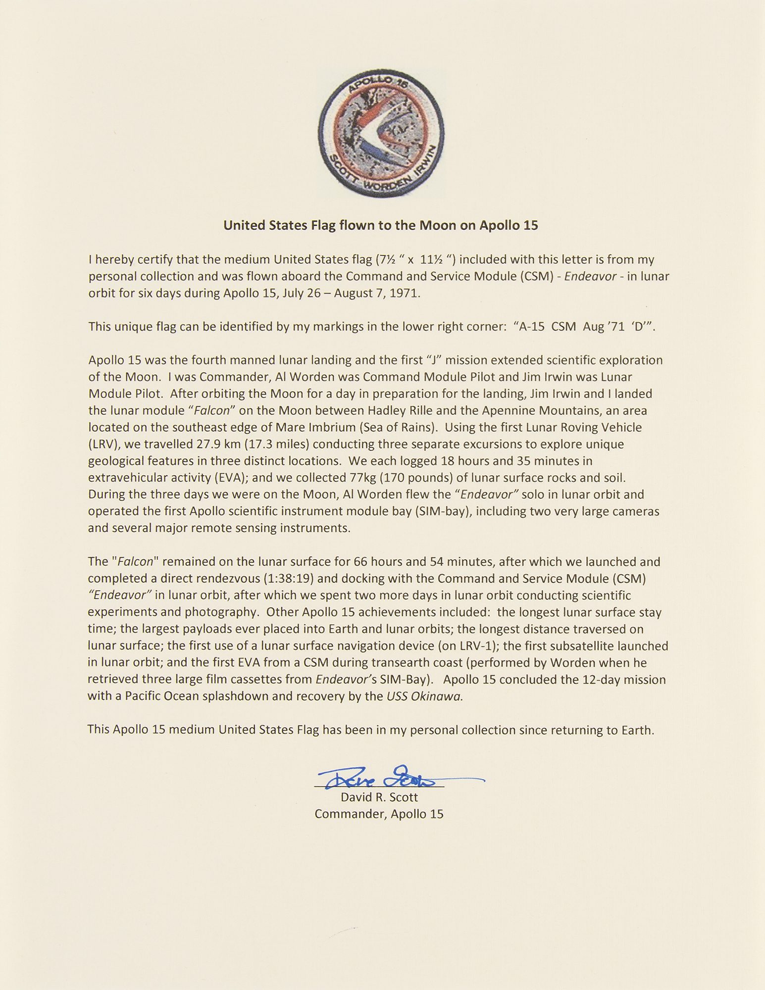 Immensely desirable mid-sized flown American flag carried into lunar orbit on Apollo 15, 11.5 x 7.75, signed in the lower right corner in blue ballpoint by mission CDR Dave Scott with his first initial, "D," adding, "A-15, CSM Aug. '71." In fine condition, with a central vertical fold. Accompanied by a signed letter of provenance from Scott, in part: "I hereby certify that the medium United States flag…is from my personal collection and was flown aboard the Command and Service Module (CSM) Endeavor in lunar orbit for six days during Apollo 15, July 26–August 7, 1971…After orbiting the Moon for a day in preparation for the landing, Jim Irwin and I landed the lunar module ‘Falcon’ on the Moon between Hadley Rille and the Apennine Mountains…During the three days we were on the Moon, Al Worden flew the ‘Endeavor’ solo in lunar orbit…The ‘Falcon’ remained on the lunar surface for 66 hours and 54 minutes, after which we launched and completed a direct rendezvous…docking with the Command and Service Module (CSM) ‘Endeavor’ in lunar orbit, after which we spent two more days in lunar orbit conducting scientific experiments and photography…This Apollo 15 medium United States Flag has been in my personal collection since returning to Earth.” A superb example of one of the most highly sought flown formats.