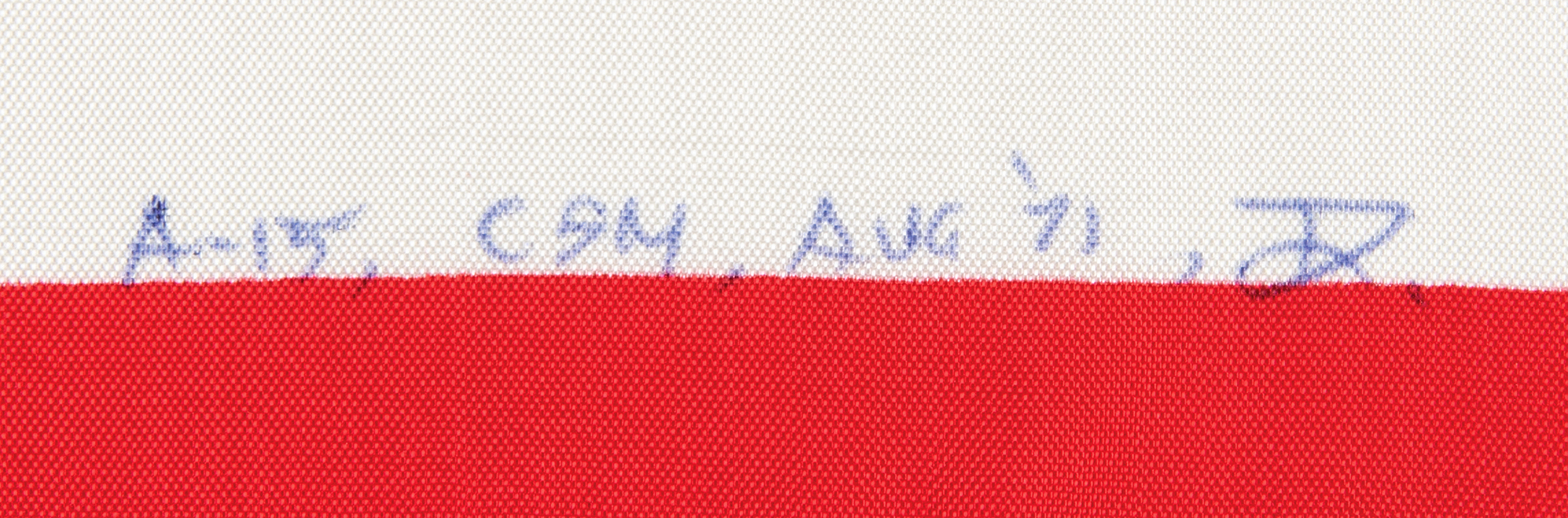 Immensely desirable mid-sized flown American flag carried into lunar orbit on Apollo 15, 11.5 x 7.75, signed in the lower right corner in blue ballpoint by mission CDR Dave Scott with his first initial, "D," adding, "A-15, CSM Aug. '71." In fine condition, with a central vertical fold. Accompanied by a signed letter of provenance from Scott, in part: "I hereby certify that the medium United States flag…is from my personal collection and was flown aboard the Command and Service Module (CSM) Endeavor in lunar orbit for six days during Apollo 15, July 26–August 7, 1971…After orbiting the Moon for a day in preparation for the landing, Jim Irwin and I landed the lunar module ‘Falcon’ on the Moon between Hadley Rille and the Apennine Mountains…During the three days we were on the Moon, Al Worden flew the ‘Endeavor’ solo in lunar orbit…The ‘Falcon’ remained on the lunar surface for 66 hours and 54 minutes, after which we launched and completed a direct rendezvous…docking with the Command and Service Module (CSM) ‘Endeavor’ in lunar orbit, after which we spent two more days in lunar orbit conducting scientific experiments and photography…This Apollo 15 medium United States Flag has been in my personal collection since returning to Earth.” A superb example of one of the most highly sought flown formats.