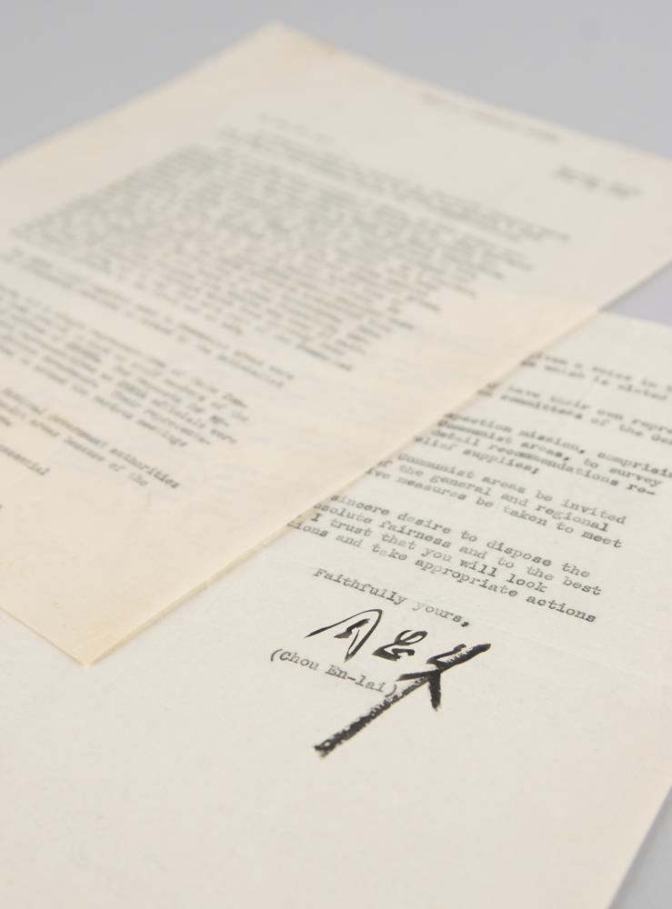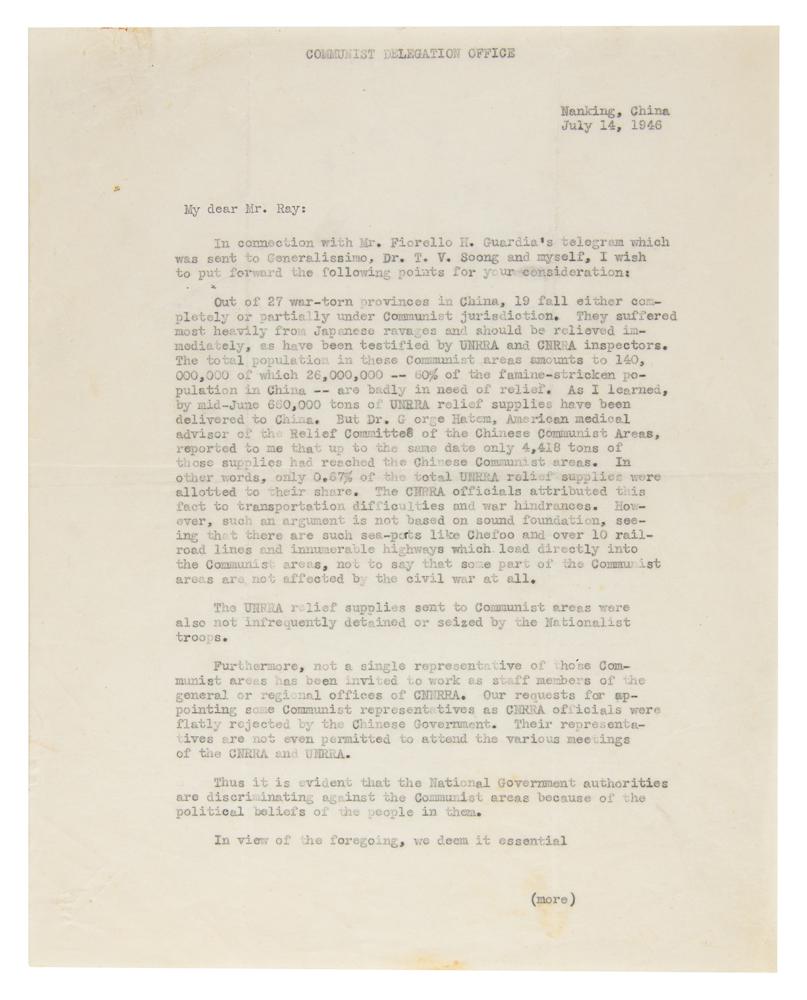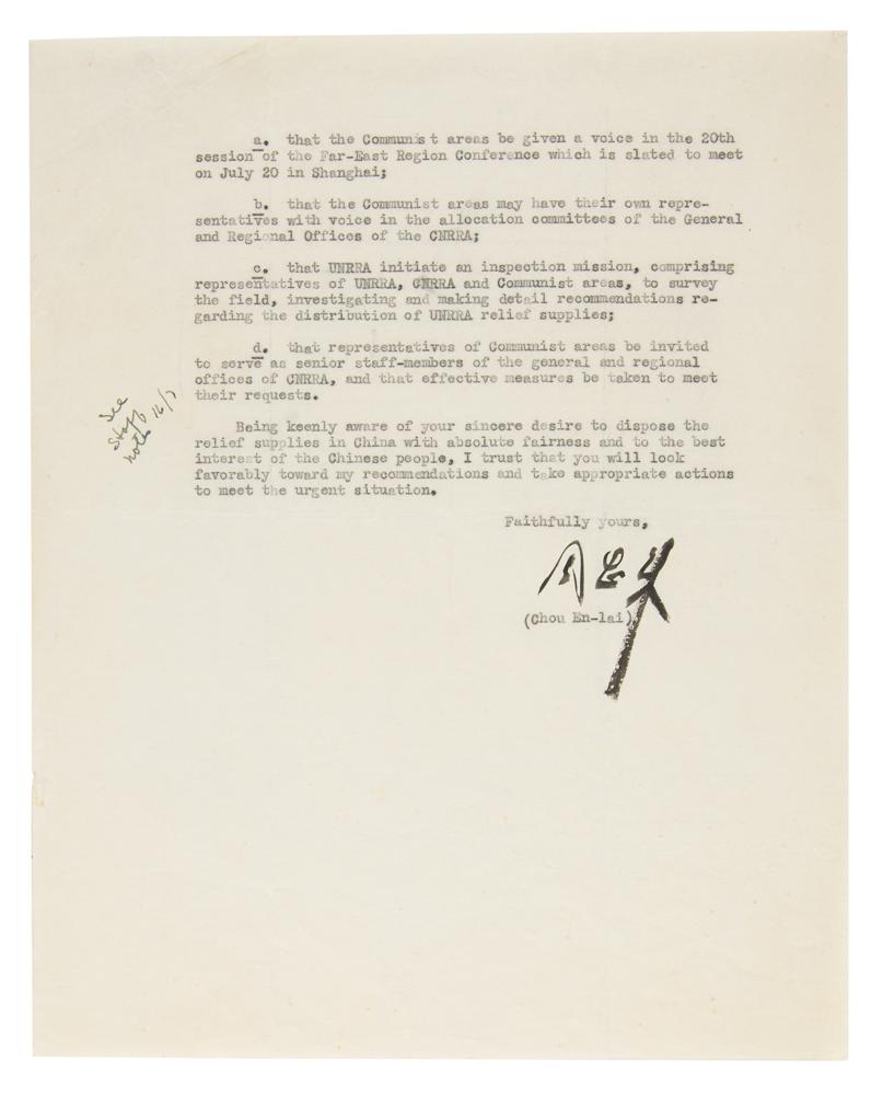 Chinese revolutionary and politician (1898-1976) who was the chief diplomatic representative of the Communist Party as the Premier of the People's Republic of China from 1949-76. Extremely rare TLS in English, signed in Chinese by Chou En-lai, two pages, 8 x 10, July 14, 1946. Letter to "Mr. Ray," J. Franklin Ray, Acting Director of the United Nations Relief and Rehabilitation Administration (UNRRA) China Office, asking for recognition and relief of Communist areas in China during the Chinese Civil War. In full: "In connection with Mr. Fiorello H. Guardia's telegram which was sent to Generalissimo, Dr. T. V. Soong and myself, I wish to put forward the following points for your consideration: