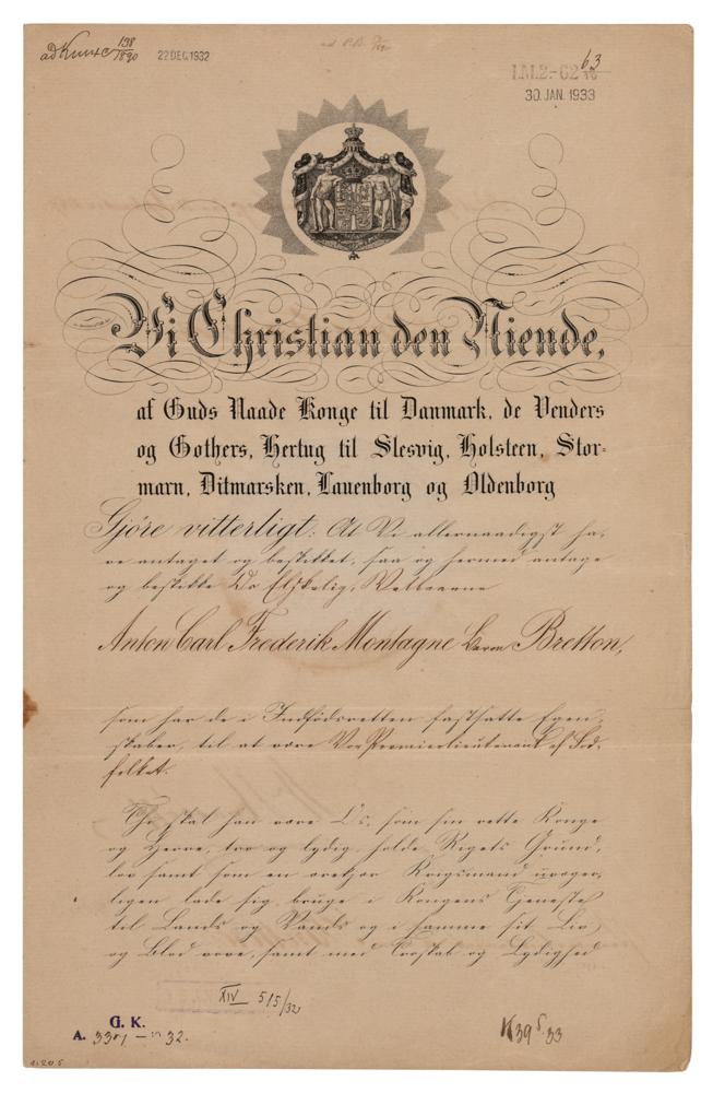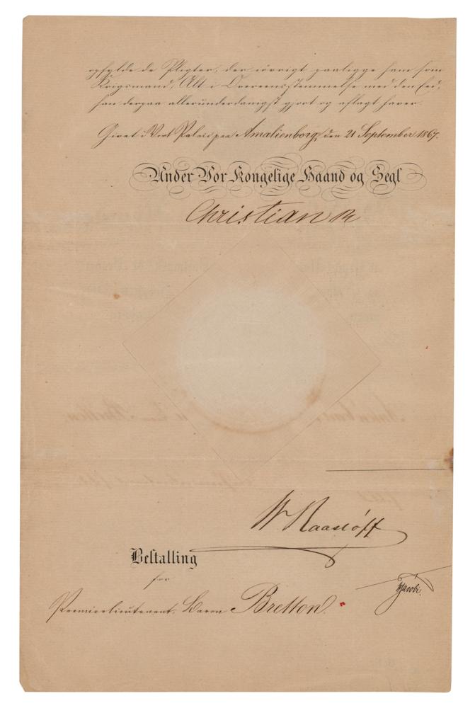 King of Denmark from 1863 until his death in 1906, whose six children married into other European royal families, earning him the sobriquet 'the father-in-law of Europe.' Partly-printed DS in Danish, signed “Christian R.,” one page, 9 x 14, September 21, 1867. Untranslated official document issued by King Christian IX, neatly signed at the conclusion in ink. The large embossed paper seal affixed at the conclusion remains intact. In fine condition, with small tape repairs to the inner hinge.