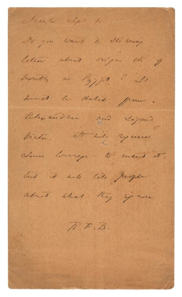 English explorer, translator, writer, soldier, and diplomat (1821-1890) renowned for his travels and explorations within Asia and Africa, as well as his extraordinary knowledge of languages and cultures. ALS signed “R. F. B.,” one page, 3.25 x 5.5, September 1, [no year]. Handwritten letter to James S. Cotton in London and mailed from Trieste when Burton was serving as the British Consul. Burton asks his correspondent if he would like a stirring letter about Egypt, sent from Alexandria, noting that it "will require courage to insert it." Addressed on the reverse in Burton's hand. In fine condition, with horizontal creases and two tiny staple holes.