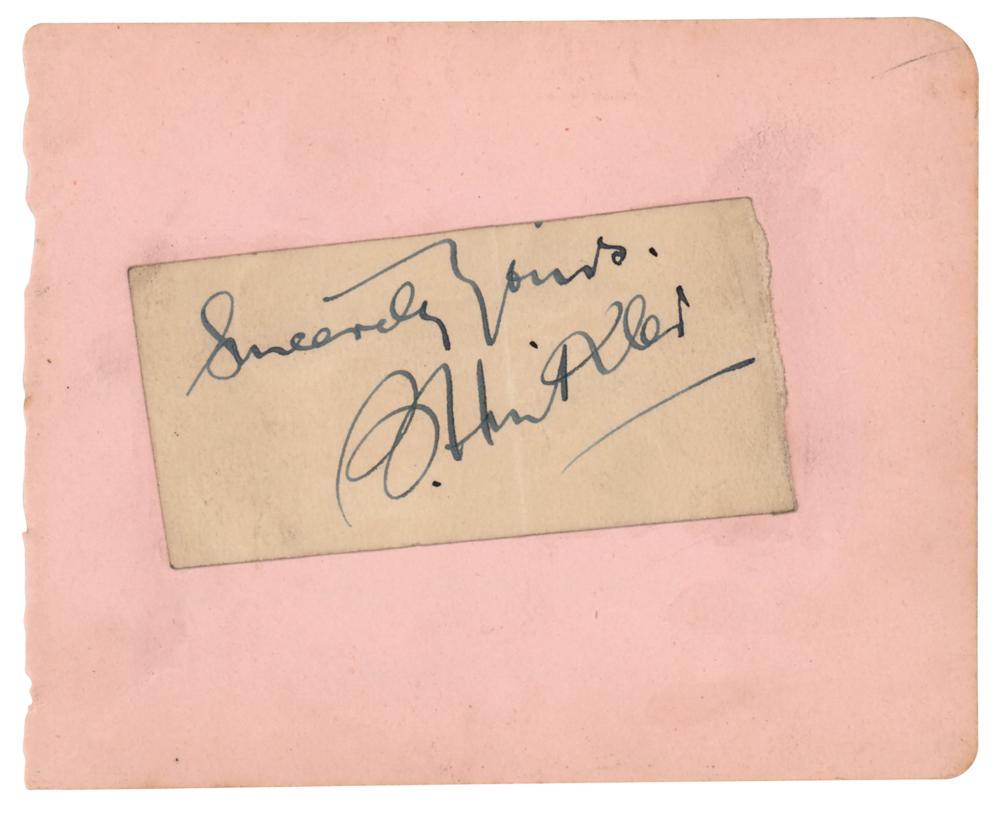 Pioneering Australian aviator (1892-1933) known as the 'Australian Lone Eagle.' In 1928 he became the first person to fly solo from England to Australia and the first person to fly solo across the Southern Atlantic Ocean. In 1931, he flew a de Havilland Puss Moth from Canada to New York then non-stop to Jamaica (1,500 miles) then to Venezuela, Guyana, Brazil and across the South Atlantic to Africa. He was killed at the age of 40 in 1933 when trying to break the speed record from England to Australia and crashed into the hills in Tuscany. Scarce vintage fountain pen signature, "Sincerely yours, B. Hinkler,” on an off-white 3.25 x 1.5 slip affixed to a pink album page. In fine condition, with an unobtrusive central vertical fold.