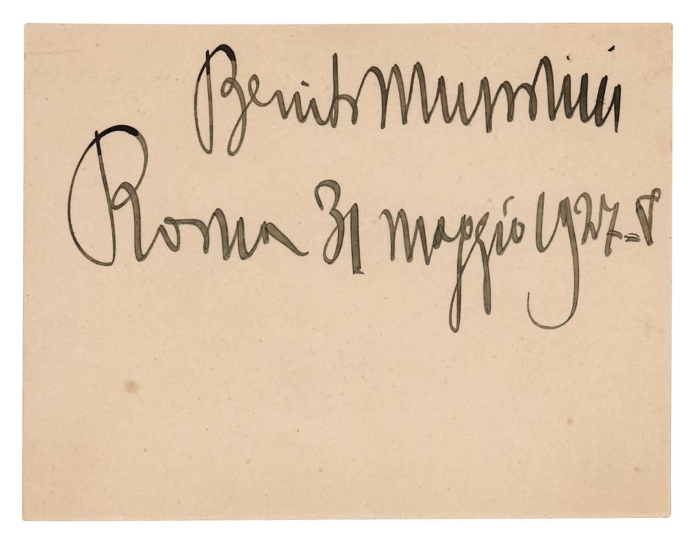 Fountain pen signature, "Benito Mussolini, Roma, 31 Maggio 1927,” on an off-white 5 x 3.75 card. In very fine condition.