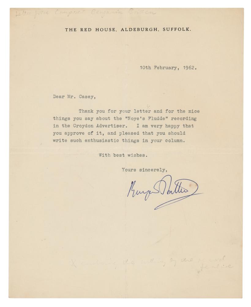 Important British composer (1913-1976), widely regarded as the greatest since Purcell, whose works include the opera Peter Grimes, the War Requiem, and scores of choral works. TLS, one page, 8 x 10, The Red House (Aldeburgh) letterhead, February 10, 1962. Letter to a journalist, in full: “Thank you for your letter and for the nice things you say about the ‘Noye's Fludde’ recording in the Croydon Advertiser. I am very happy that you approve of it, and pleased that you should write such enthusiastic things in your column.” In fine condition.