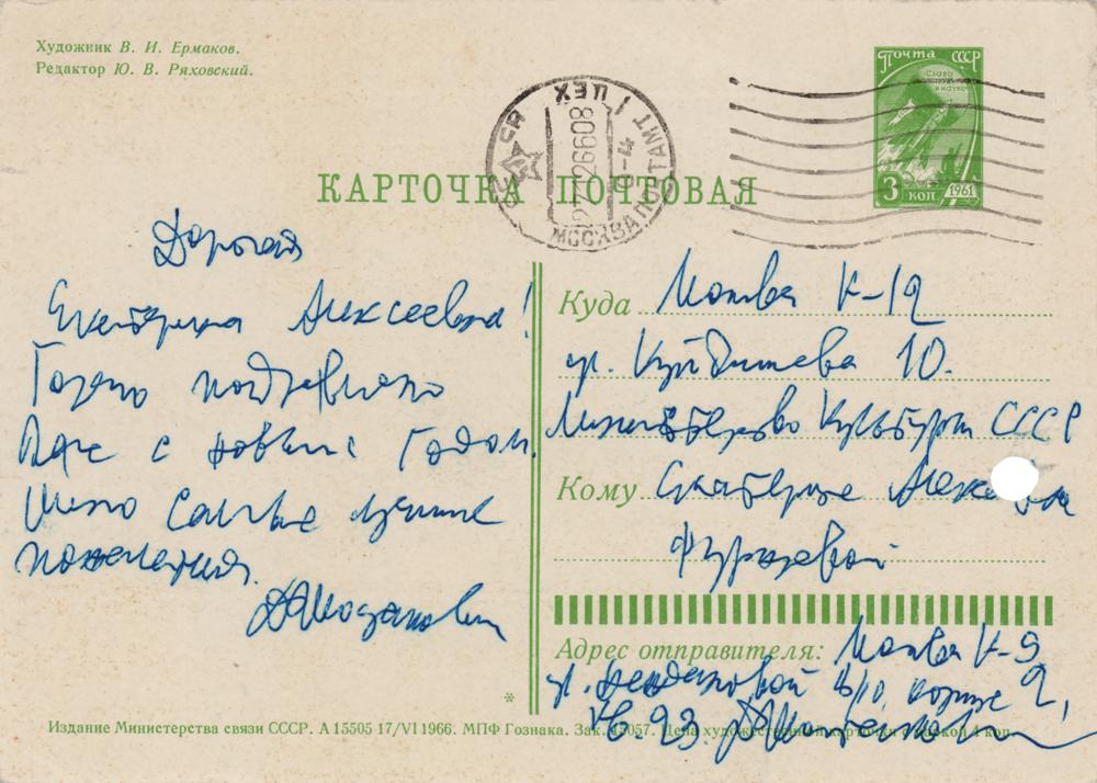 Soviet composer (1906-1975) whose fifteen symphonies occupy a place of central performance in the orchestral literature of the twentieth century. Twice-signed ALS in Cyrillic, signed “D. Shostakovich,” penned on the reverse of a 5.75 x 4 holiday-themed postal card, postmarked December 27, 1966. A brief handwritten letter to Soviet Minister of Culture Yekaterina Furtseva, in full (roughly translated): “I warmly congratulate you with New Year, and send my very best wishes.” Shostakovich incorporates his signature into his return address in the lower right corner. In fine condition, with one file hole touching the address.