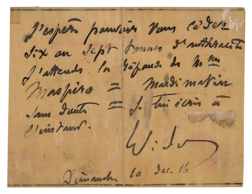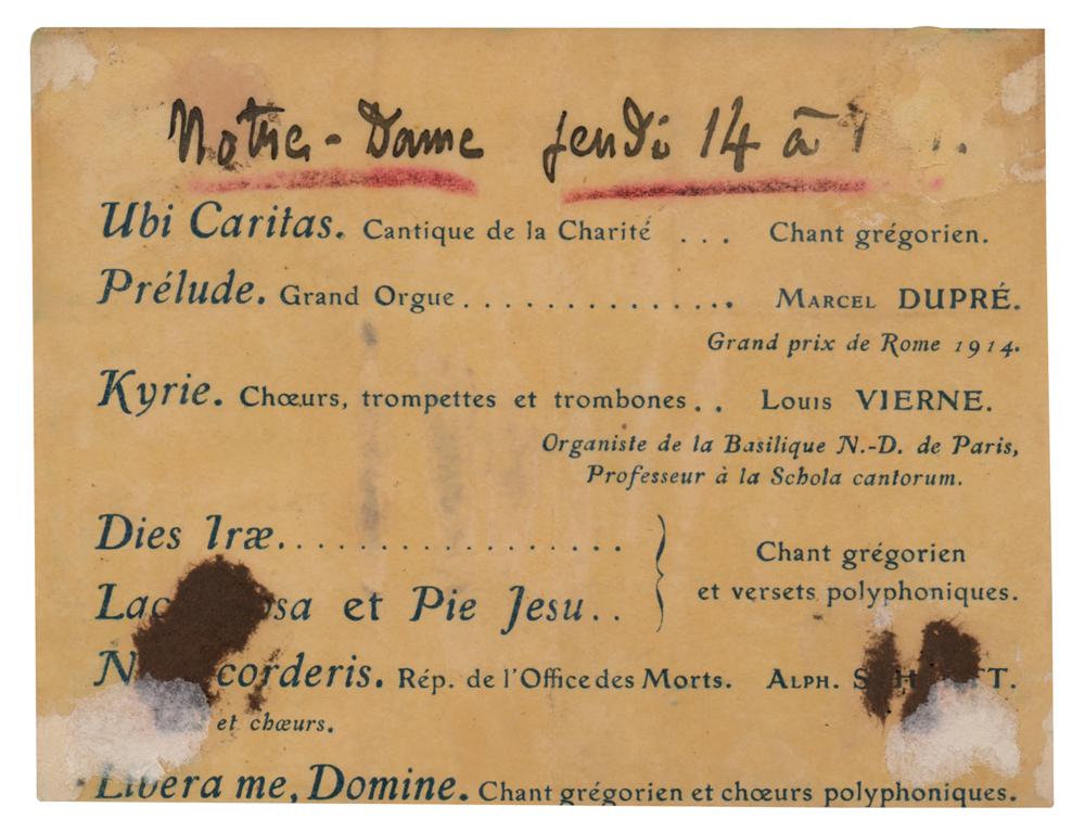 French organist, composer and teacher (1844-1937) who is most notable for his 10 organ symphonies. ALS in French, signed “Widor,” penned on the reverse of a 4.25 x 3.25 program for a Notre Dame Cathedral concert featuring Marcel Dupre and Louis Vierne, December 20, 1916. A handwritten letter, in full (translated): “I hope to be able to give you six, or seven tons of anthracite (coal). I await the answer of Monsieur Maspero. Tuesday morning I will have another shipment. I will write to him immediately.” In very good to fine condition, with light scuffing and toning, and a central vertical fold.