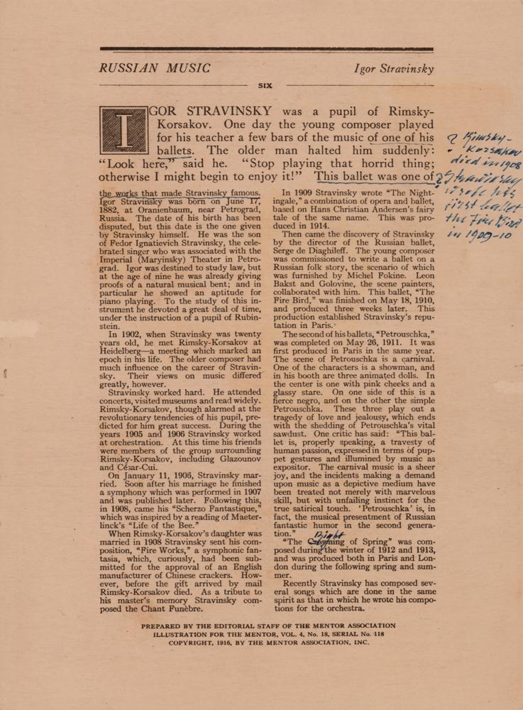 World War II-dated 7 x 9.5 The Mentor promotional print of an artistic portrayal of the Russian composer, signed and inscribed in fountain pen, "To Mr. Alfred Kaiser, Sincerely, Igor Stravinsky, 1942,” who amends and underlines sections of the biography found on the reverse of the print: “? Rimsky-Korsakov died in 1908, ? Stravinsky wrote his first ballet the Fire Bird in 1909-10.” In fine condition, with a small tear to the bottom edge. Accompanied by the original mailing envelope.