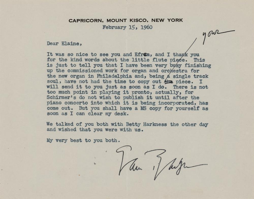 Celebrated composer (1910-1981) whose Adagio for Strings is widely considered a masterpiece of modern classical music. TLS, one page, 7.25 x 5.75, Capricorn, Mount Kisco letterhead, February 15, 1960. Letter to esteemed flautist Elaine Shaffer, in full: “It was so nice to see you and Efrem, and I thank you for the kind words about the little flute piece. This is just to tell you that I have been very busy finishing up the commissioned work for organ and orchestra for the new organ in Philadelphia and, being a single track soul, have not had the time to copy out your piece. I will send it to you just as soon as I do. There is not too much point in playing it pronto, actually, for Schirmer's do not wish to publish it until after the piano concerto into which it is being incorporated, has come out. But you shall have a MS copy for yourself as soon as I can clear my desk. We talked of you both with Betty Harkness the other day and wished that you were with us.” In fine condition.