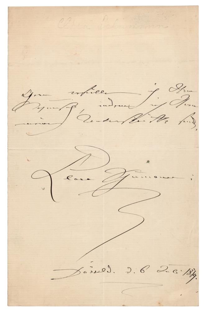 Composer and one of the most distinguished pianists of the Romantic era (1819-1896). She and her husband, composer Robert Schumann, were early champions of Johannes Brahms. ALS in German, one page, 5.75 x 8.75, February 26, 1879. A brief untranslated handwritten letter from Clara Schumann. In fine condition.