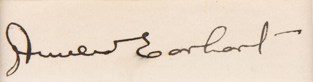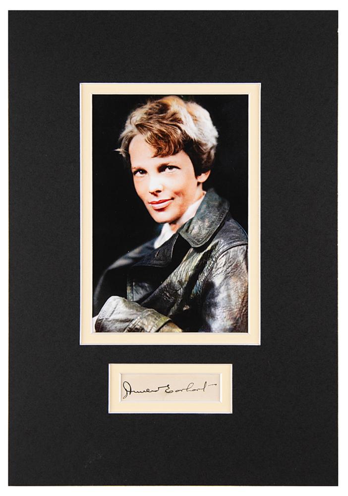 Bold vintage fountain pen signature, "Amelia Earhart,” on an off-white 2.5 x .75 slip, double-matted with a portrait of the aviatrix to an overall size of 7.75 x 11.25. In fine condition, with a trivial brush to the signature.