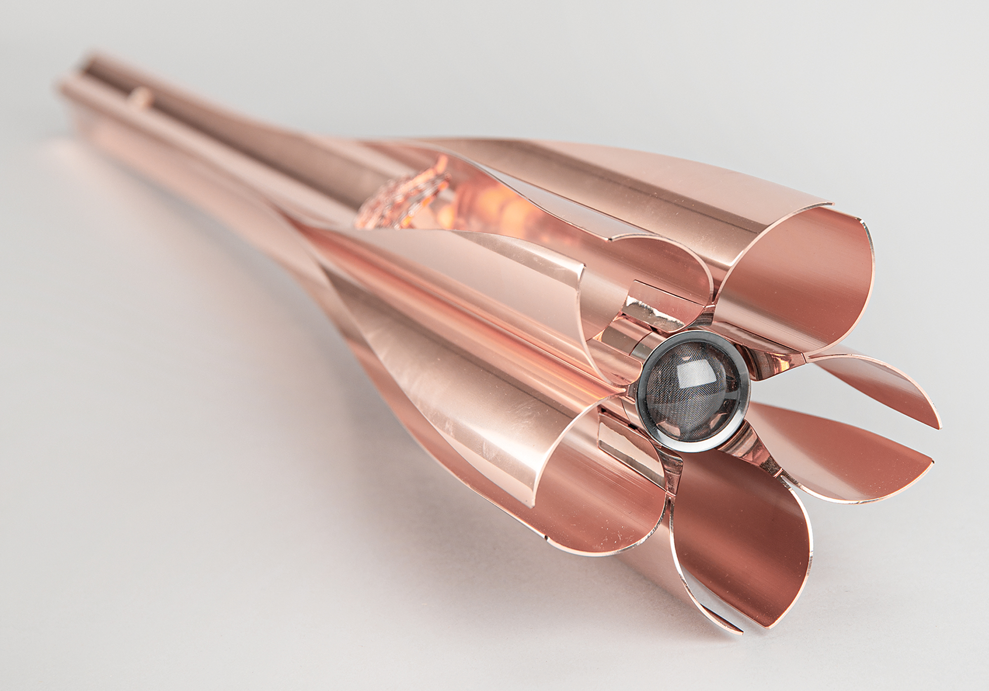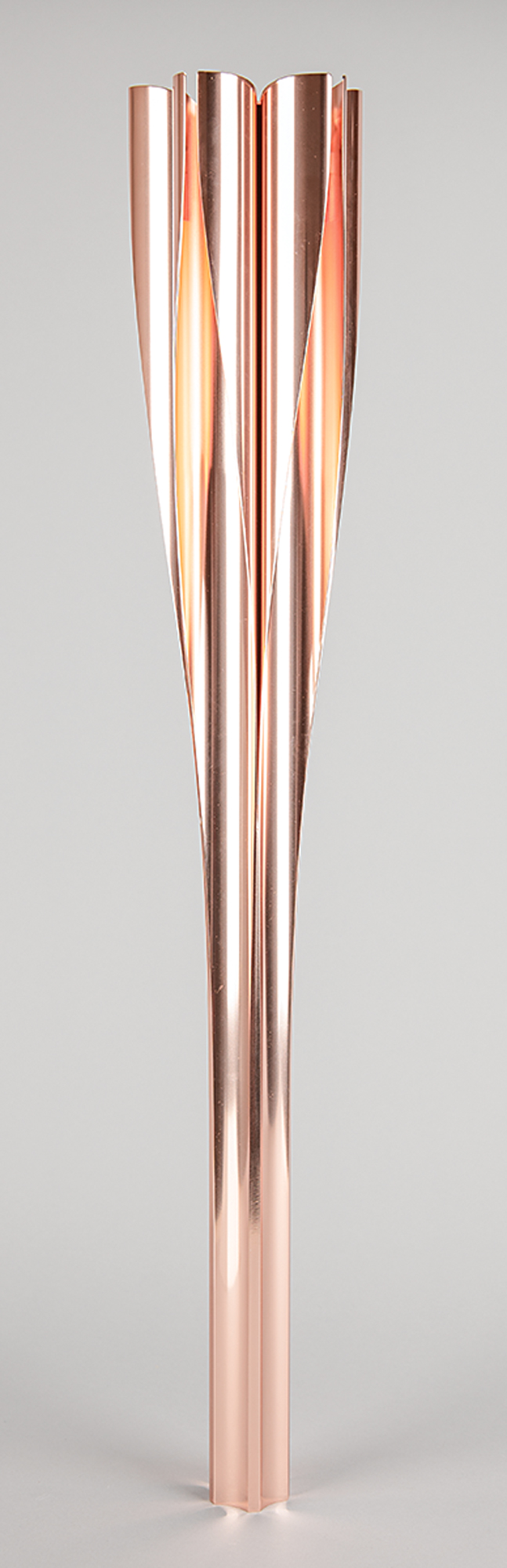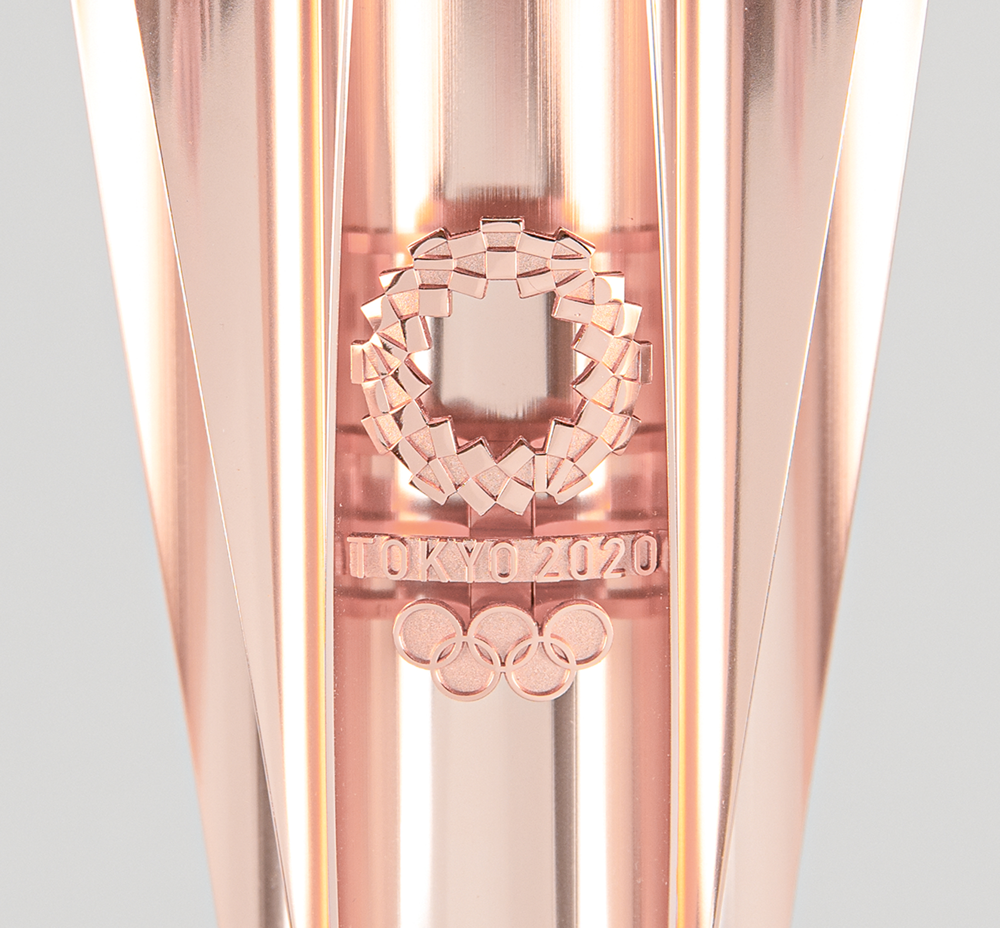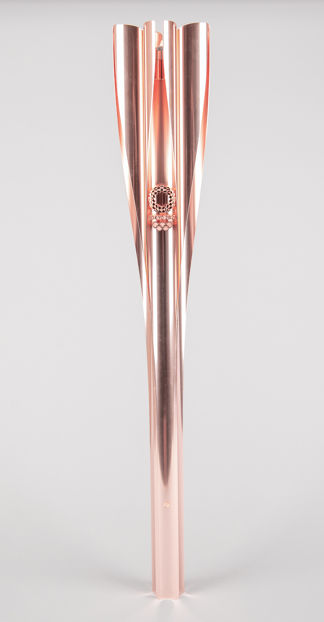 Official Tokyo 2020 Summer Olympics torch, constructed of recycled aluminum from temporary housing used after the Fukushima, Japan, disaster in 2011. Designed by Tokujin Yoshioka and inspired by Japanese cherry blossoms, the torch measures 28″ long and 4.5″ at its widest point. Finished in a 'sakura' rose-gold color, the torch has a fluted design featuring five petal-shaped columns around the tip, with the "Tokyo 2020" wreath emblem and Olympic rings on the front. The five separate flames from the ‘flower petals’ come together as one at the center of the torch to give off a brilliant light known as the ‘Path of Hope.’ The torch is missing its bottom cap. Includes its original storage cylinder.