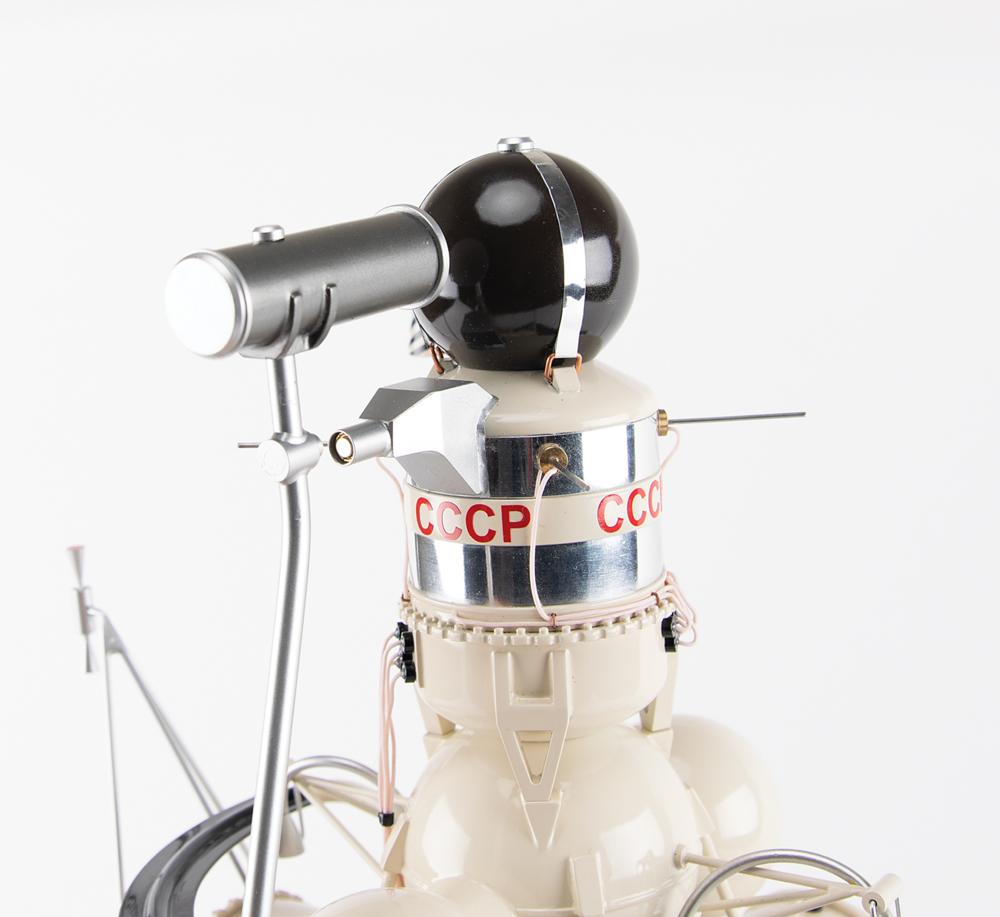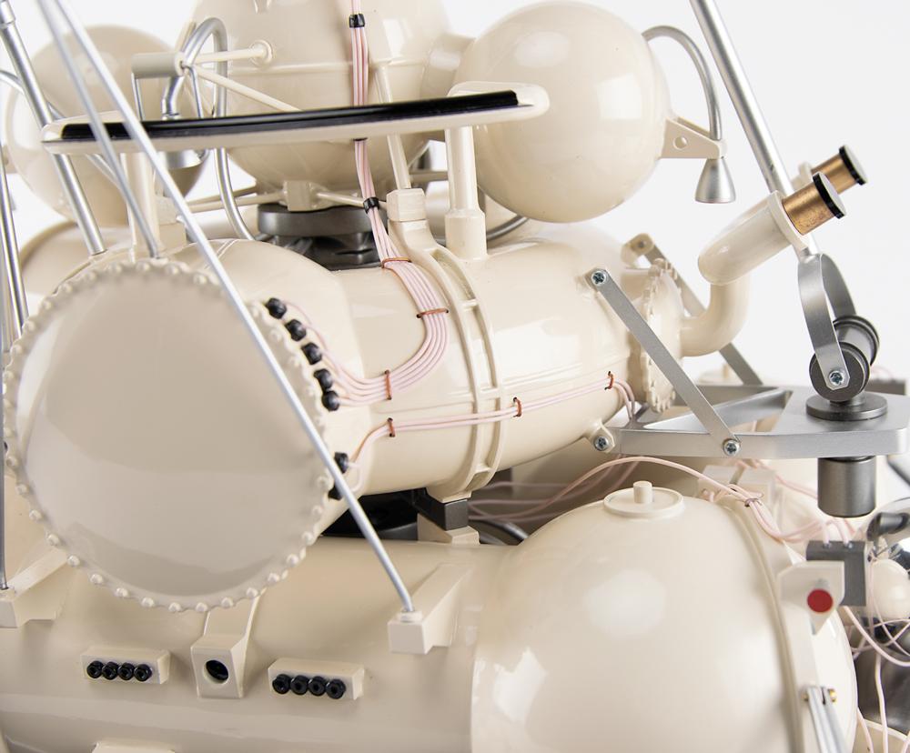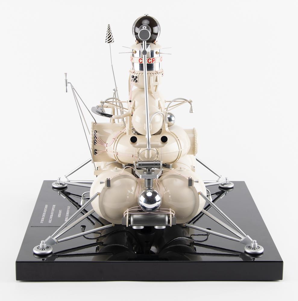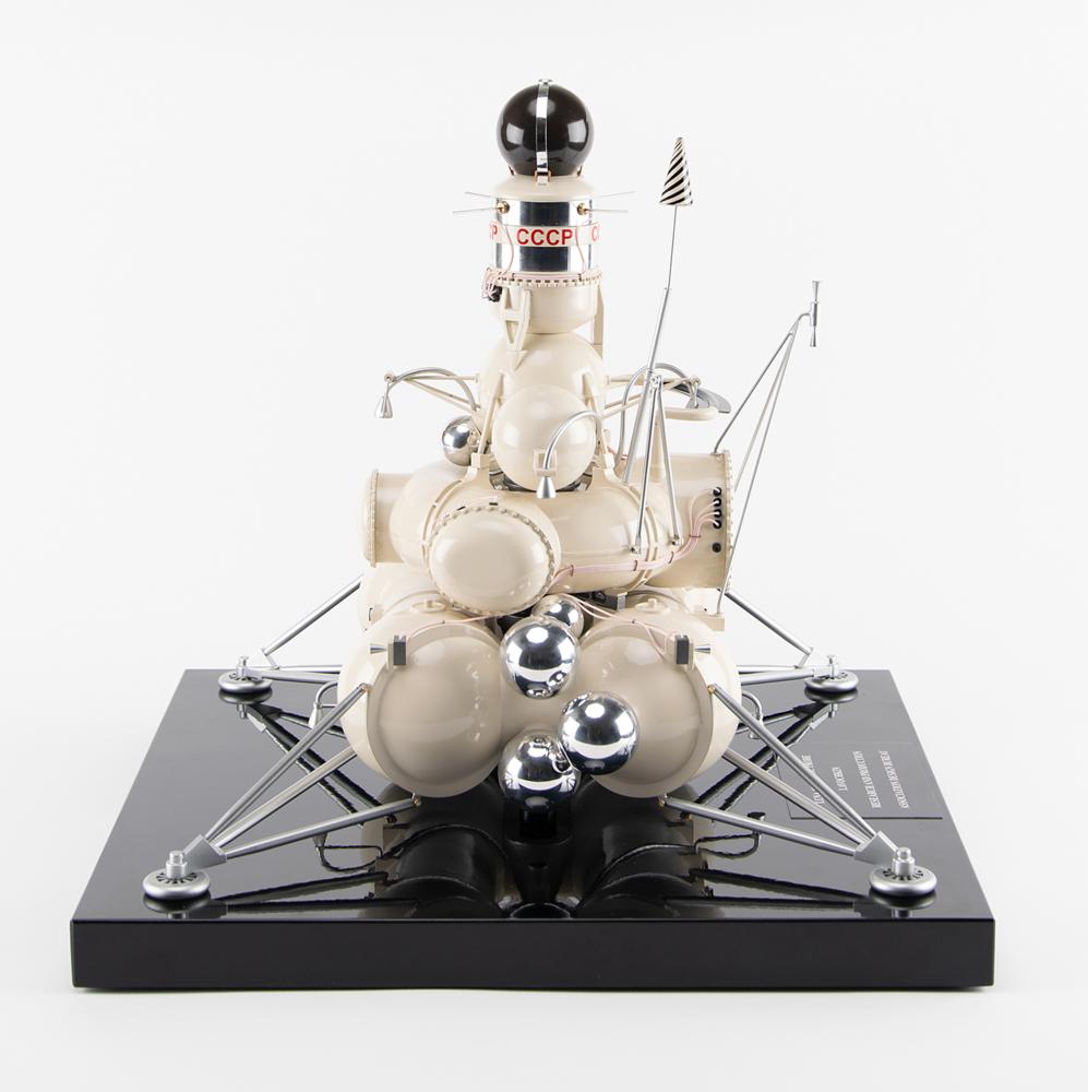 The spacecraft consisted of an ascent stage mounted on top of a descent stage. Portrayed here in tremendous detail, the lower descent stage featured a cylindrical body with four protruding landing legs, fuel tanks, a landing radar, and a dual descent engine complex, and was equipped with a television camera, radiation and temperature monitors, telecommunications equipment, and an extendable arm with a drilling rig for the collection of a lunar soil sample. The ascent stage was a cylinder with a rounded top and carried a hermetically sealed soil sample container inside a re-entry capsule. The probe launched on September 12, 1970, entered lunar orbit, and then landed on the surface on September 20. It collected a sample of lunar soil and returned to Earth on September 24, becoming the first successful robotic probe to land on the lunar surface. A meticulously crafted model representing this historic automated lunar mission.