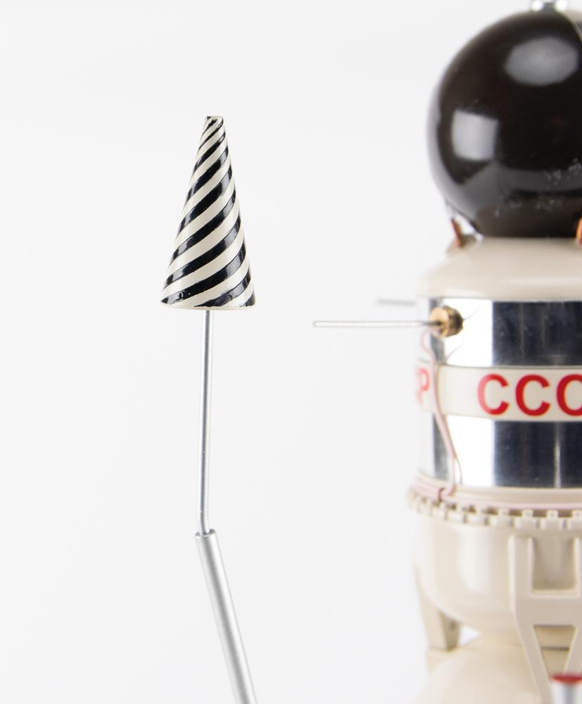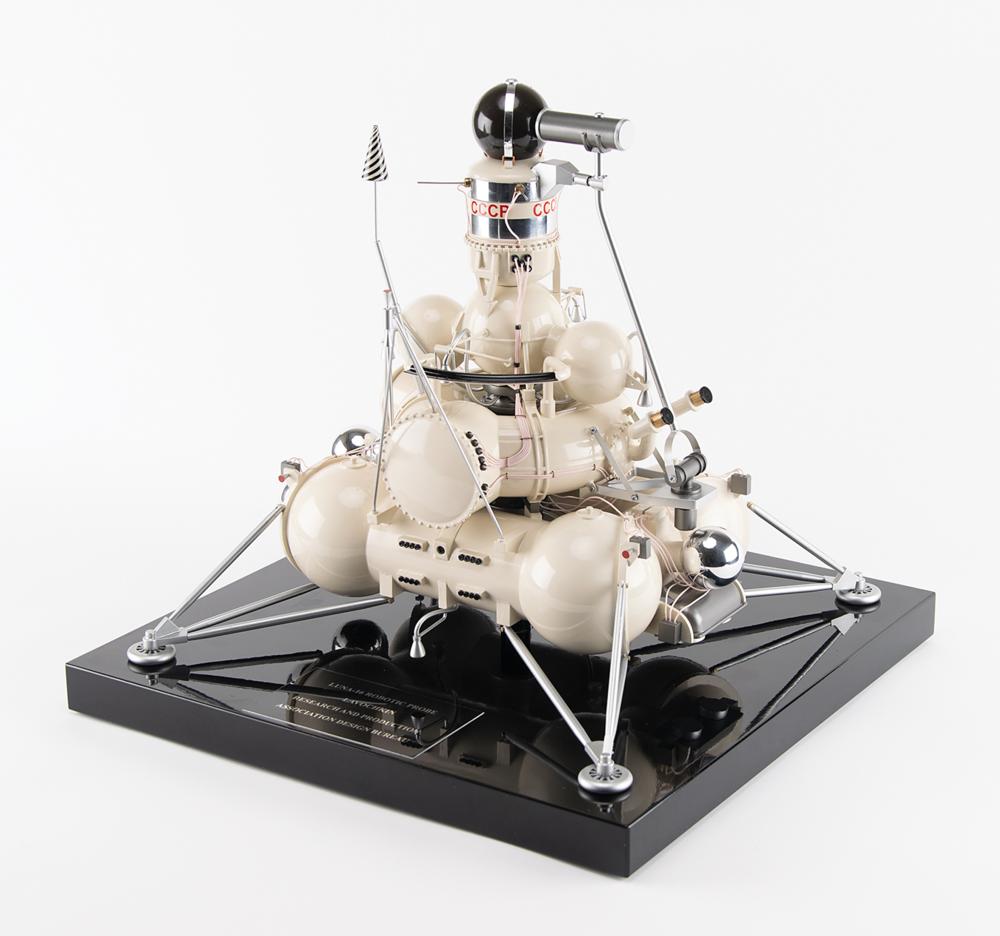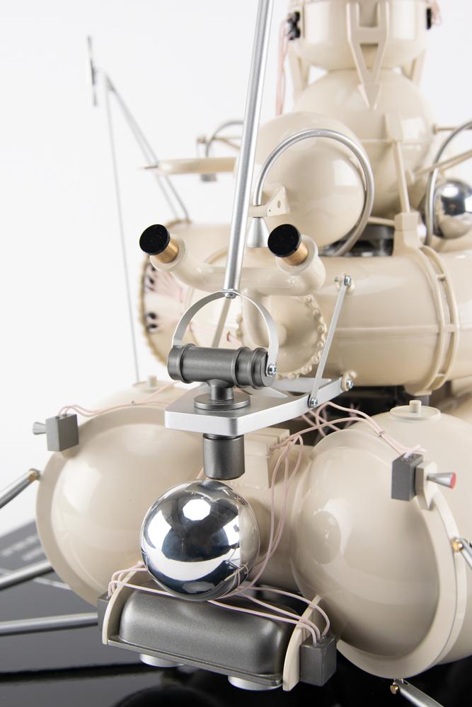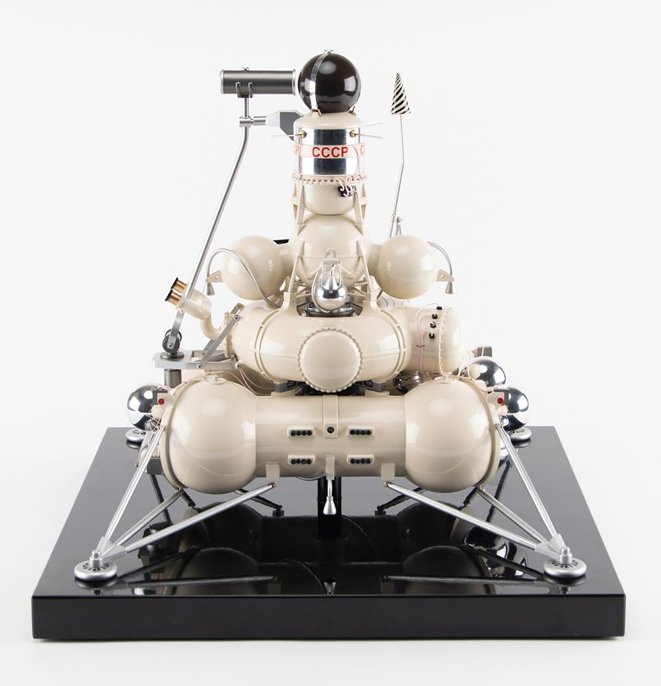 The spacecraft consisted of an ascent stage mounted on top of a descent stage. Portrayed here in tremendous detail, the lower descent stage featured a cylindrical body with four protruding landing legs, fuel tanks, a landing radar, and a dual descent engine complex, and was equipped with a television camera, radiation and temperature monitors, telecommunications equipment, and an extendable arm with a drilling rig for the collection of a lunar soil sample. The ascent stage was a cylinder with a rounded top and carried a hermetically sealed soil sample container inside a re-entry capsule. The probe launched on September 12, 1970, entered lunar orbit, and then landed on the surface on September 20. It collected a sample of lunar soil and returned to Earth on September 24, becoming the first successful robotic probe to land on the lunar surface. A meticulously crafted model representing this historic automated lunar mission.