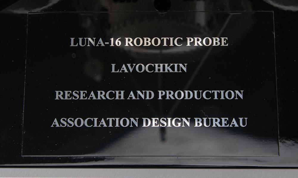 Exceptional 1:10 scale handmade presentation model of the Luna-16 spacecraft, measuring approximately 16.5 x 15 x 16, constructed of metal with elements of plastic composite, produced as an exclusive project presentation model by the Lavochkin Research and Production Association. Presented on a black 17″ x 17″ base with an engraved plaque. In fine condition.