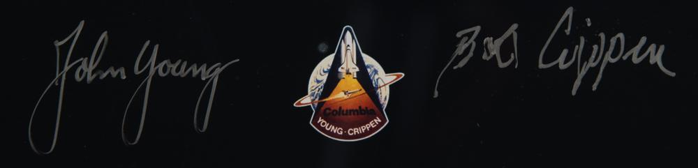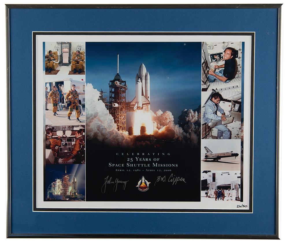 Limited edition color semi-glossy 14.5 x 11.75 composite photo honoring the 25th anniversary of the first Space Shuttle mission, numbered 26/50, signed in silver ink by STS-1 astronauts John Young and Bob Crippen. Double-matted and framed to an overall size of 19 x 16. In very fine condition. Accompanied by a certificate of authenticity from the Astronaut Scholarship Foundation.