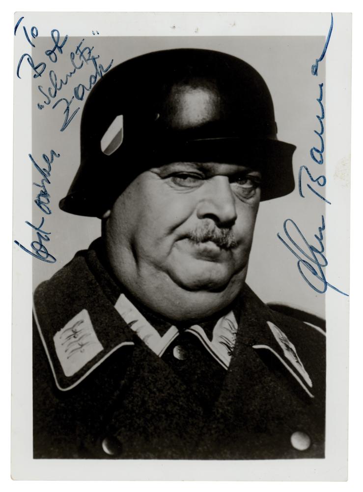 Three photos signed by the stars of Hogan's Heroes: a glossy 8 x 10 photo of Bob Crane as Col. Hogan, signed and inscribed in black felt tip, "To Peg—Many thanks for all your help—Bob Crane"; a glossy 5 x 7 photo of John Banner as Sgt. Schultz, signed and inscribed in black felt tip, "To Bob 'Schultz' Zask, best wishes, John Banner"; and a glossy 8 x 10 photo of Werner Klemperer as Col. Klink, signed in red felt tip. In overall fine condition, with a Beckett label affixed to the lower corner of the Klemperer photo. Accompanied by a certificate of authenticity from Beckett Authentication Services for Klemperer's autograph.