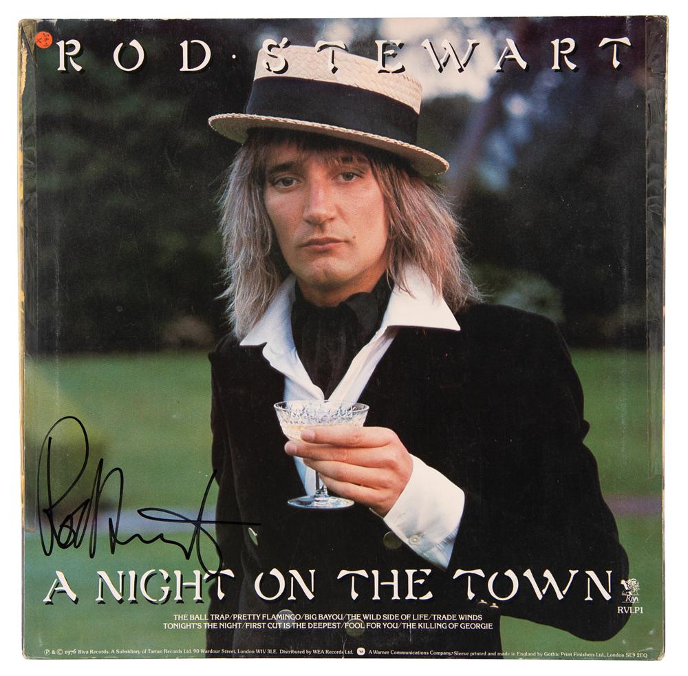 A Night on the Town album by Rod Stewart, who has signed the back cover in black felt tip. In very good to fine condition, with old clear tape along the separated side edges. The record is not included.