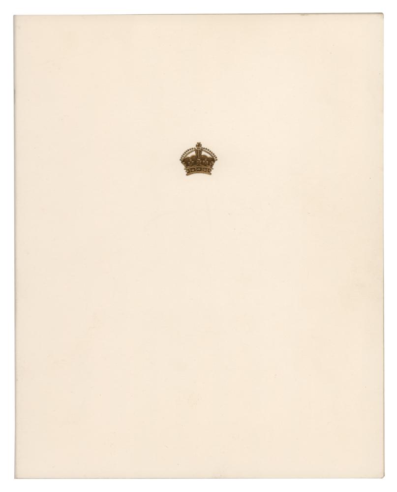 Christmas card from 1973 with an embossed crown on the front, measuring 14.75 x 9.25 open, the inside featuring a color photo portrait of the Queen Mother posing outdoors, signed on the adjacent page below the preprinted sentiment in black ballpoint, "from, Elizabeth R." In very fine condition.