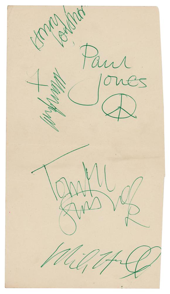 Vintage green ballpoint signatures of Manfred Mann—Mike Hugg, Paul Jones, Tom McGuinness, Henry Lowther, and Manfred Mann—on an off-white 4.5 x 8 sheet. The consignor notes that the autographs were obtained when the group performed in Cwmbran, Wales in the mid-1960s. In fine condition, with a trimmed right edge and central horizontal fold. Accompanied by a certificate of authenticity from Tracks.