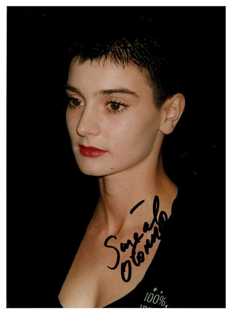 Color glossy 5 x 7 candid photo of Sinead O’Conner in a beautiful bust-length pose, signed nicely in black felt tip. The consignor notes that the signature was obtained by in-person autograph collector Clive Bullimore in London, England. In fine condition, with light surface scuffing. Accompanied by a certificate of authenticity from Tracks.