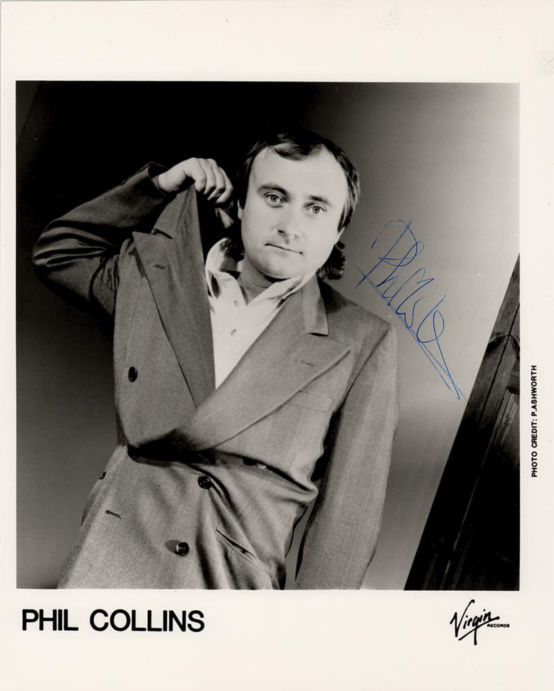 Glossy 8 x 10 Virgin Records promotional photo of Phil Collins yanking on his own collar, signed in blue ink. In fine condition. Accompanied by a certificate of authenticity from Tracks.