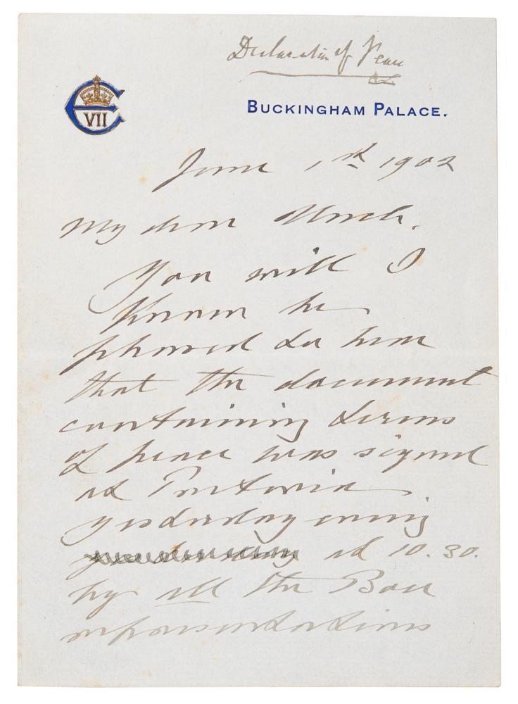 Overjoyed at the news of peace following this divisive war, Edward VII writes to the Duke, in full: "You will I know be pleased to hear that the document containing terms of peace was signed at Pretoria yesterday evening at 10.30 by all the Boer representatives as well as by Lords Milner and Kitchener—this is indeed a matter of great congratulation throughout the country & I am greatly overjoyed. I do not know yet when the announcement is to be made public—so perhaps you will kindly keep the news for yourself!" In fine condition.