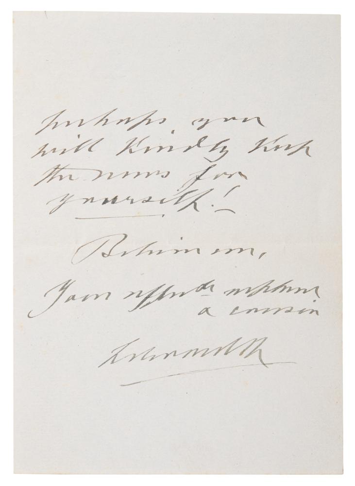 ALS signed “Believe me, your affec'te nephew & cousin, Edward R,” three pages on two adjoining sheets, 4.5 x 6.5, Buckingham Palace letterhead, June 1, 1902. Handwritten letter to his great uncle, Prince George, Duke of Cambridge, announcing the end of the Second Boer War. The Duke of Cambridge had been Commander-in-Chief of the Forces from 1856 to 1895, adamantly opposing military reforms in favor of upholding tradition. The resulting weaknesses of the British Army were exposed at the outset of the Second Boer War: despite far superior numbers, the unprepared British forces were overwhelmed by the effective guerrilla tactics of the Boers. The result was the largest and most costly war in which Great Britain engaged between the Napoleonic Wars and World War I.