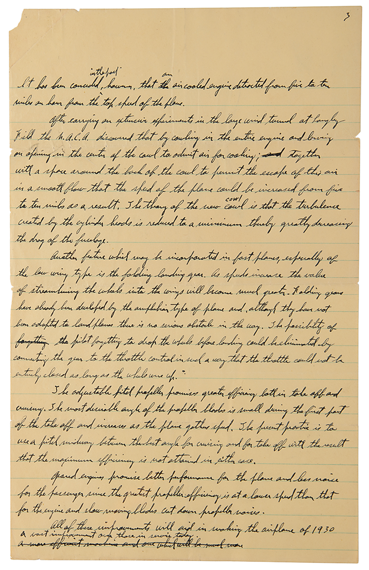 Another feature which may be incorporated in fast planes, especially of the low wing type is the folding landing gear. As speeds increase the value of streamlining the wheels into the wings will become much greater…The adjustable pitch propellor promises greater efficiency both in take off and cruising…Geared engines promise better performance for the plane and less noise for the passenger…All of these improvements will aid in making the airplane of 1930 a vast improvement over those in service today." In fine condition, with a few edge nicks and minor losses to corners. A remarkable handwritten piece by Lindbergh, penned as he promoted new advances in powered flight.
