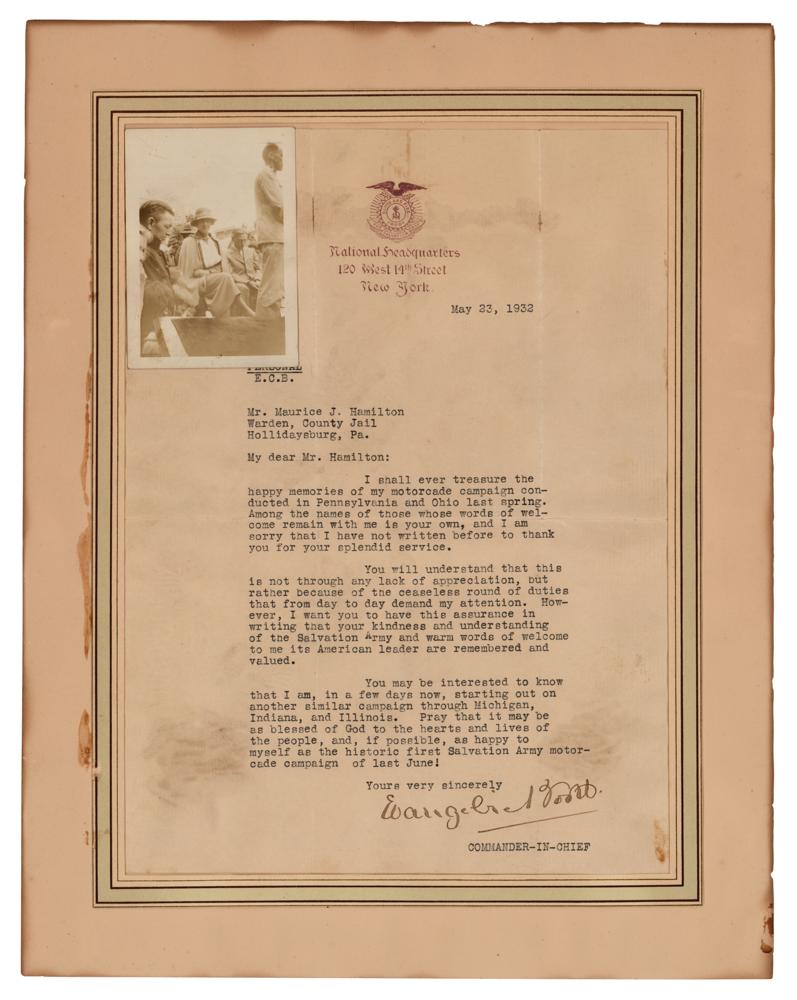 TLS, one page, 8 x 11, The Salvation Army, National Headquarters letterhead, May 23, 1932. Letter to Maurice J. Hamilton, the Warden of the County Jail in Hollidaysburg, Pennsylvania, in full: “I shall ever treasure the happy memories of my motorcade campaign conducted in Pennsylvania and Ohio last spring. Among the names of those whose words of welcome remain with me is your own, and I am sorry that I have not written before to thank you for your splendid service. You will understand that this is not through any lack of appreciation, but rather because of the ceaseless round of duties that from day to day demand my attention. However, I want you to have this assurance in writing that your kindness and understanding of the Salvation Army and warm words of welcome to me its American leader are remembered and valued. You may be interested to know that I am, in a few days now, starting out on another similar campaign through Michigan, Indiana, and Illinois. Pray that it may be as blessed of God to the hearts and lives of the people, and, if possible, as happy to myself as the historic first Salvation Army motorcade campaign of last June!” An original glossy 2.5 x 3.5 snapshot photo of Booth is affixed to the upper left corner. The letter is affixed to a slightly larger mounting sheet and in very good to fine condition, with edge toning, and old glue stains.