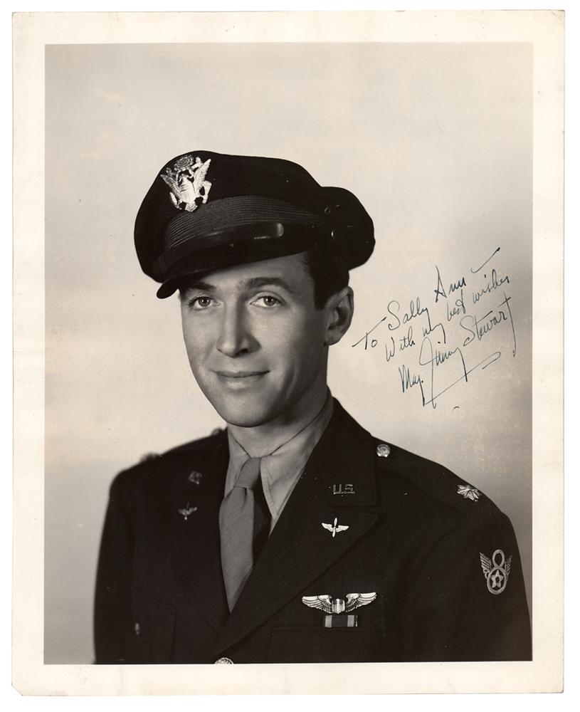 World War II-dated vintage pearl-finish 8 x 9.75 portrait of Major Stewart in his U.S. Army Air Forces military uniform, signed and inscribed in fountain pen, "To Sally Ann ? with my best wishes, Maj. Jimmy Stewart.? In very good to fine condition, with scattered light creasing, and rippling to the edges (heaviest to the left side).