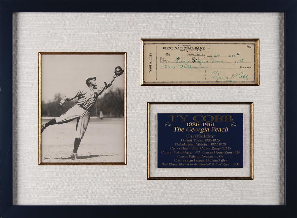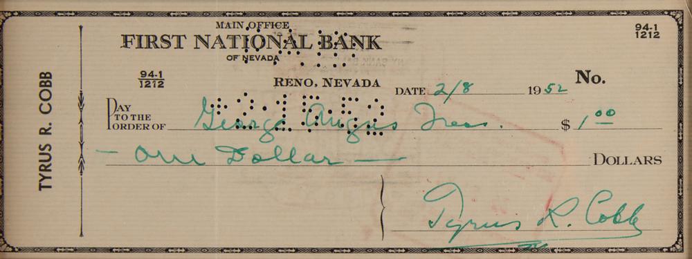 Personal check, 8 x 3, filled out and signed in green ink by Cobb, "Tyrus R. Cobb," payable to George Angus for $1, February 8, 1952. Nicely cloth-matted and framed with an engraved plaque and photo to an overall size of 20.75 x 15.25. In fine condition, with one vertical fold.