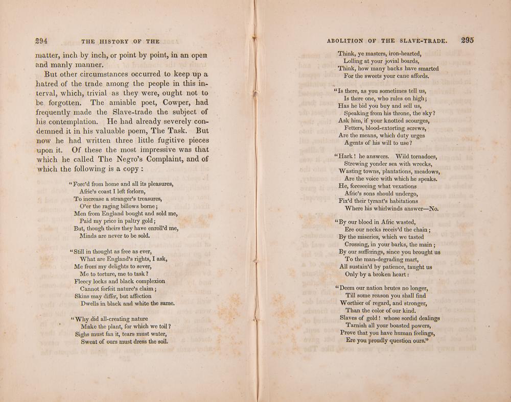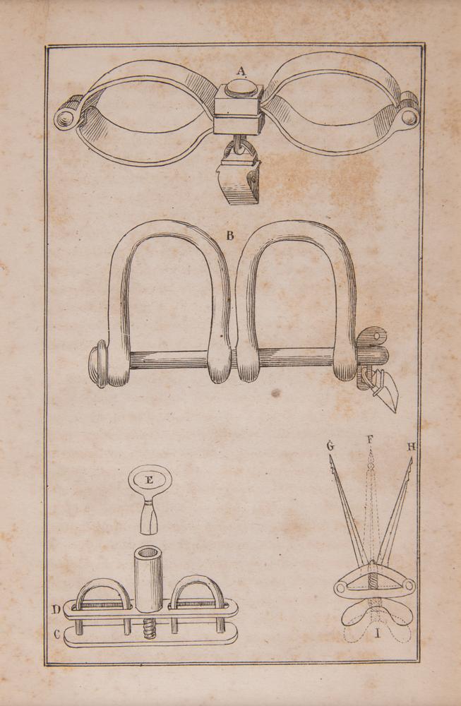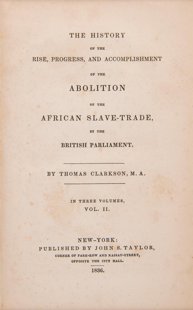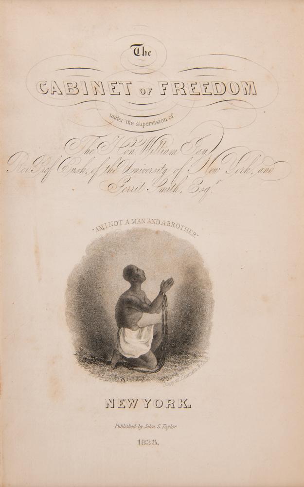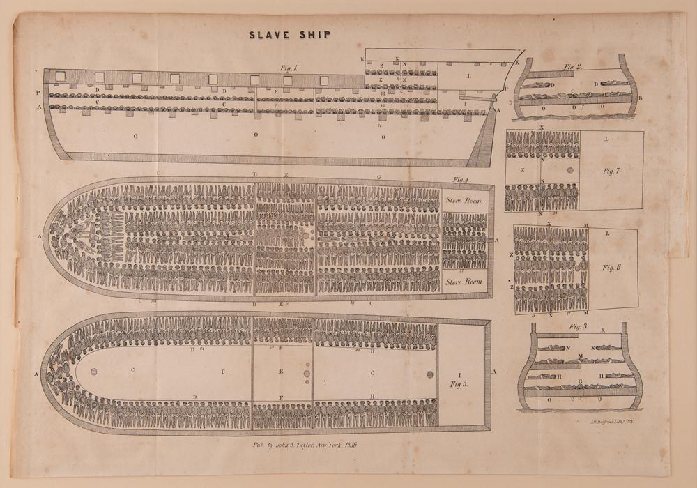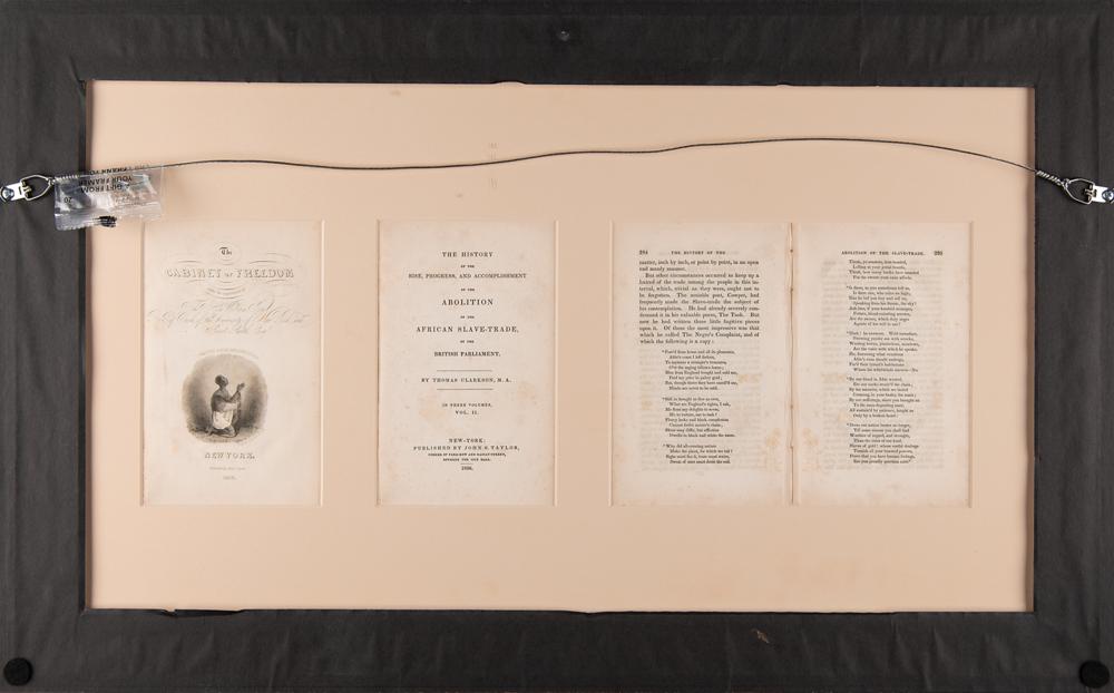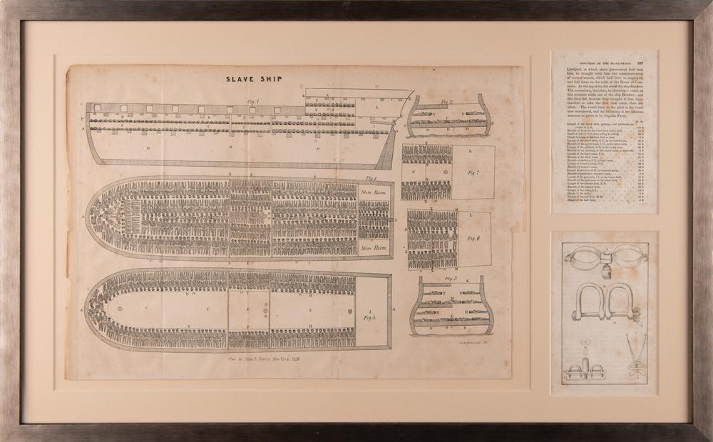 Rare lithographed plate of the powerful diagram of a "Slave Ship" by J. H. Buffords, removed from the book The Cabinet of Freedom: The History of the Rise, Progress and Accomplishment of the Abolition of the African Slave-Trade by the British Parliament, Vol. II, published in New York by John S. Taylor in 1836. Unfolded and displayed to an overall size of 17.25 x 12.25, the plate illustrates in several cross-section figures the horrifying method of stowing slaves aboard a cargo ship. The basis of the image is a diagram of the British slave ship 'Brookes' first published in 1788 by the Plymouth Chapter of the Society for Effecting the Abolition of the Slave Trade. It was subsequently widely distributed by abolitionists and used in a number of contemporary texts, including Clarkson's. It is one of the enduring images of the abolitionist movement, and a stark reminder of the brutality of the institution of slavery. Mounted and framed with two other pages from said book (images of restraints and a list of ship measurements) to an overall size of 27.75 x 17.25; Plexiglas to the frame backing reveals three windows containing the book’s title and half-title pages, as well as pages 294 and 295, which contain the poem The Negro's Complaint by William Cowper. In very good condition, with a bit of foxing, small losses along the fold in the bottom figure, and a few partial edge tears (not affecting the illustrations).