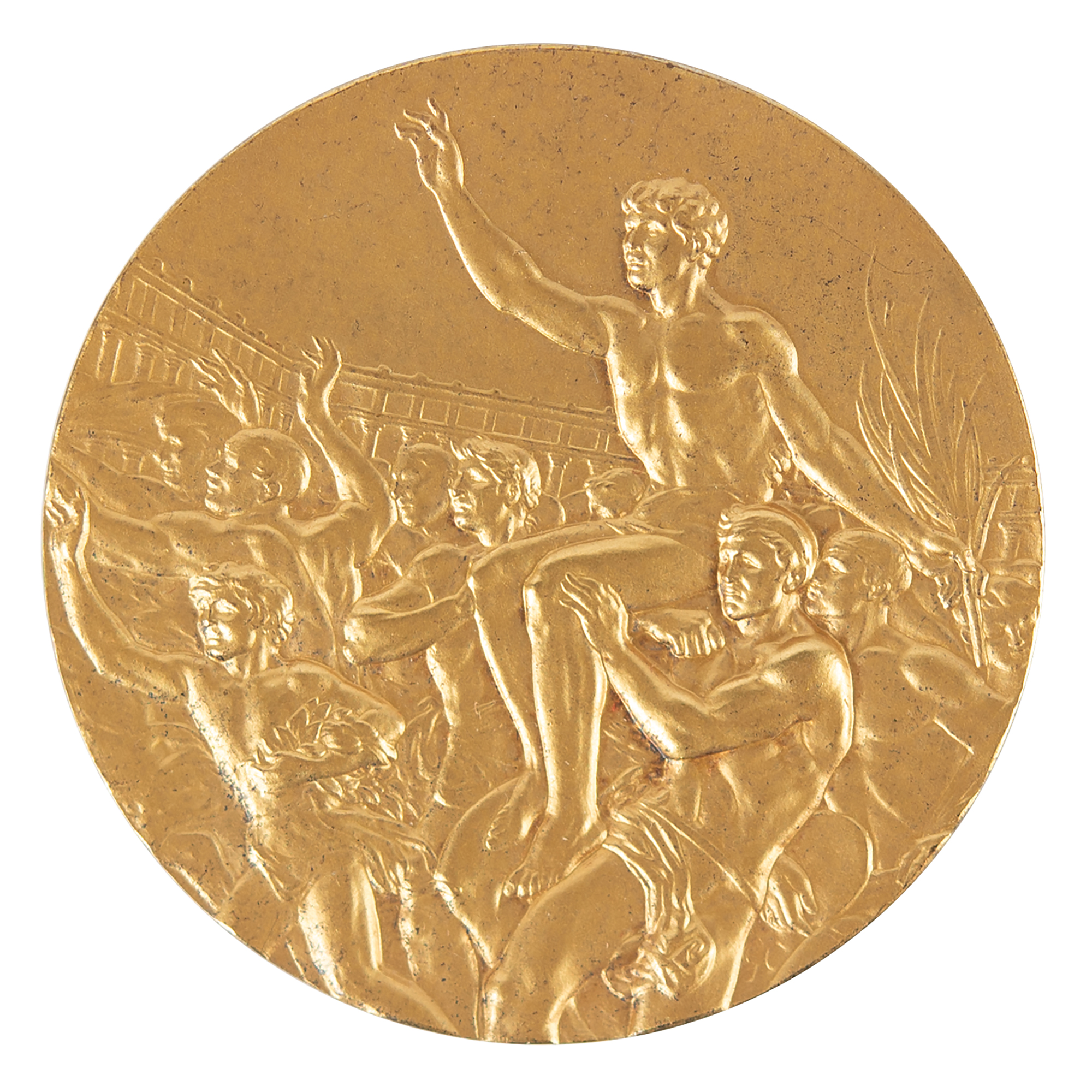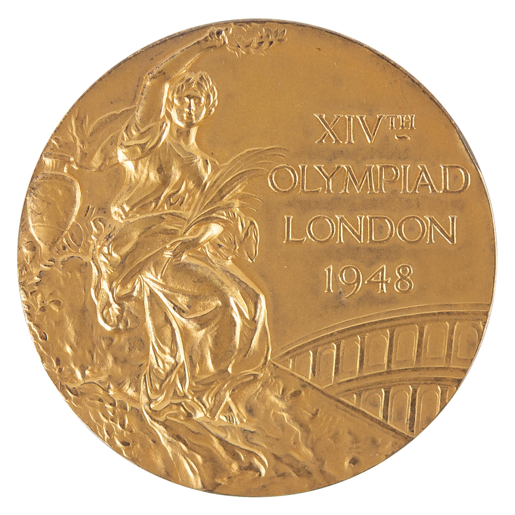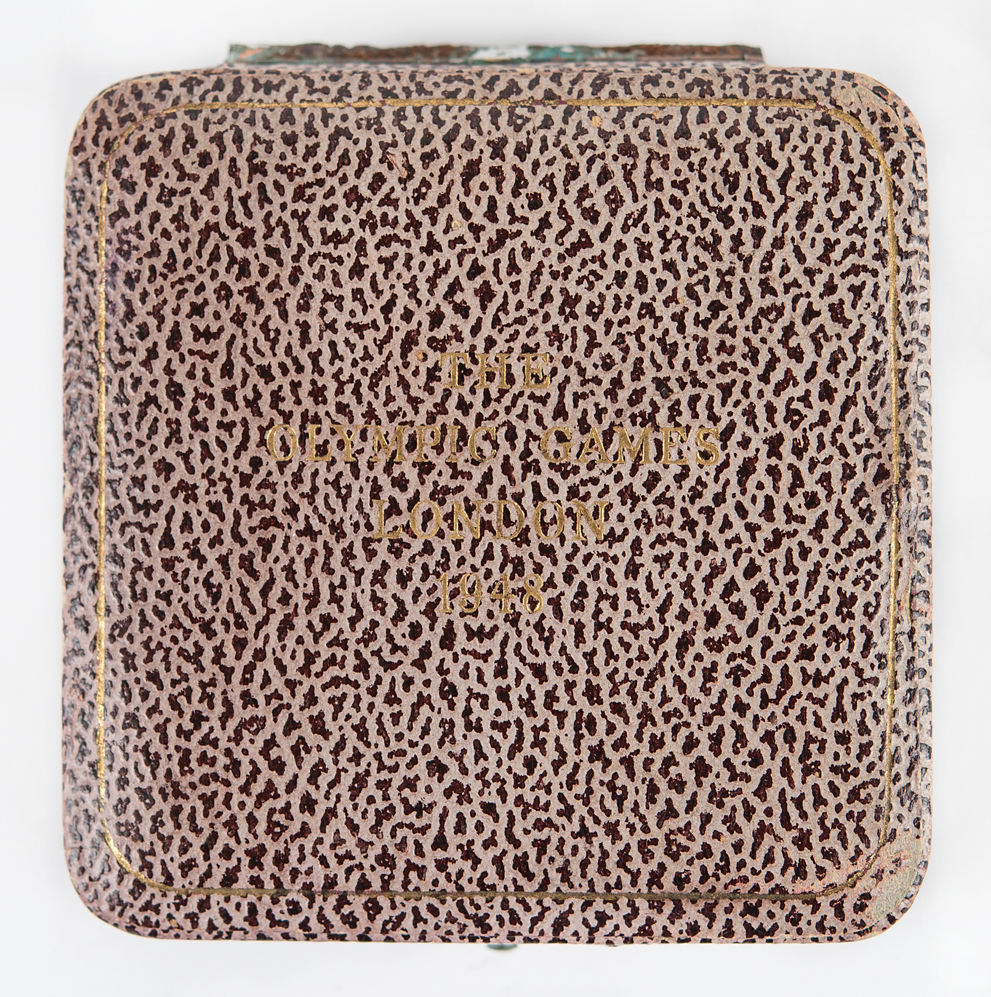 Fantastic winner's medal issued for the London 1948 Summer Olympics. Gilt silver, 51 mm, 69 gm, by Giuseppe Cassioli. The front, inscribed, "XIVth Olympiad, London, 1948," features a 'Seated Victory' with the Coliseum in the background; the reverse portrays a winner carried by jubilant athletes. Complete with its original hinged case by John Pinches (Medalists) Ltd., London, gilt-stamped on the lid: "The Olympic Games, London, 1948." The medal exhibits only minor rubbing to gilt on the edges, and the rare case's hinge is partially detached. A classic gold medal from a truly momentous Olympiad—the London Games represented the first Summer Olympics since 1936 after a twelve-year hiatus due to World War II. With only 138 first-place winner's medals awarded, they remain quite scarce—especially in their original cases—and are rarely seen in such fine condition.