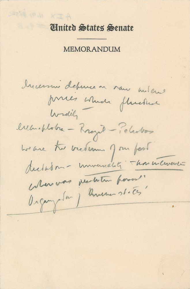 Unsigned handwritten notes in pencil by Senator John F. Kennedy, one page, 5.25 x 8, United States Senate letterhead, no date but circa 1953-1960. Notes concerning trade agreements in his difficult to decipher hand, in part: "Excessive defense on raw material, prices which fluctuate wildly?Brazil?we are the victims of our past decisions." In fine condition.