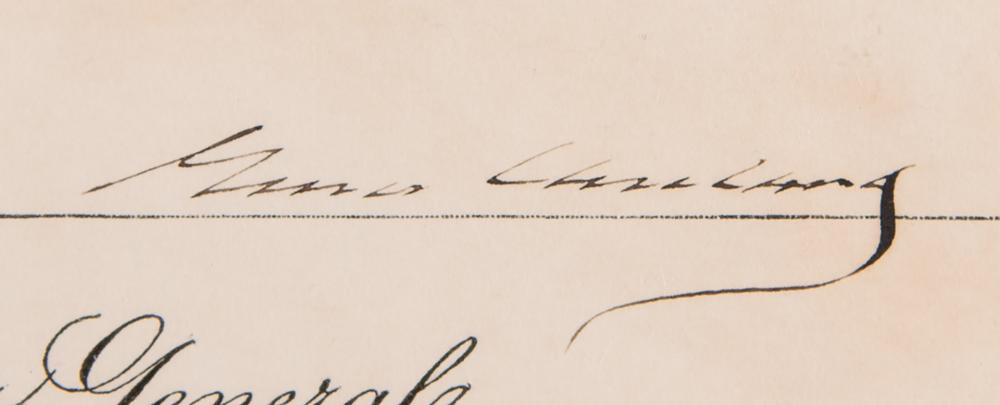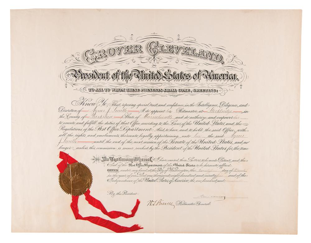 Partly-printed DS as president, one page, 22 x 17, March 21, 1895. President Cleveland appoints Agnes J. Smith as “Postmaster at Stockbridge, in the County of Berkshire, State of Massachusetts.” Signed neatly at the conclusion by Grover Cleveland and countersigned by Postmaster General Wilson S. Bissell. The original golden Post Office Department seal with red ribbon remains affixed to the lower left. In fine condition, with scattered light creasing and toning.