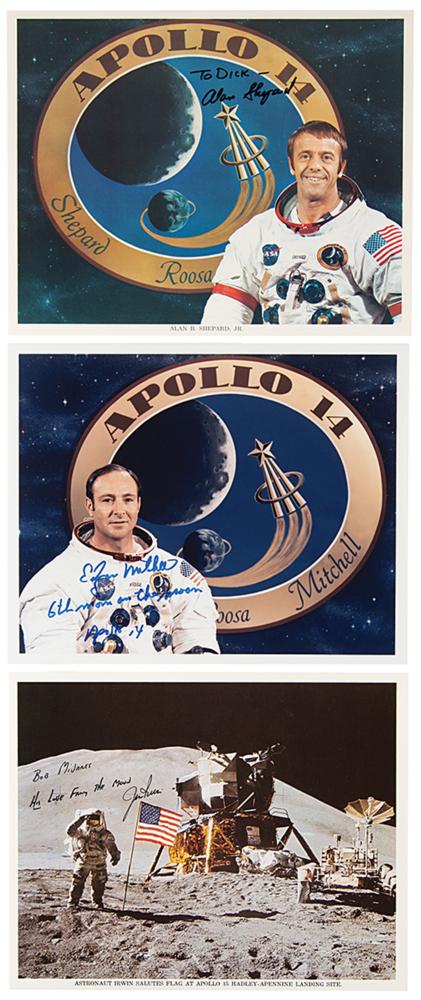 Five color photos of NASA astronauts, 8 x 10 and 10 x 8, consisting mostly of official NASA lithographs, each signed in ink by the subject. Includes: Charles Conrad, Alan Bean, Alan Shepard (ins), Edgar Mitchell, and Jim Irwin (ins). In overall fine condition.
