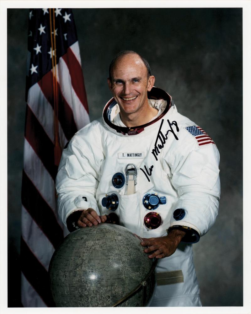 Color satin-finish 8 x 10 photo of Apollo 16 CMP Ken Mattingly posing in his white space suit with a lunar globe, signed in black felt tip, "Ken Mattingly." In very fine condition.