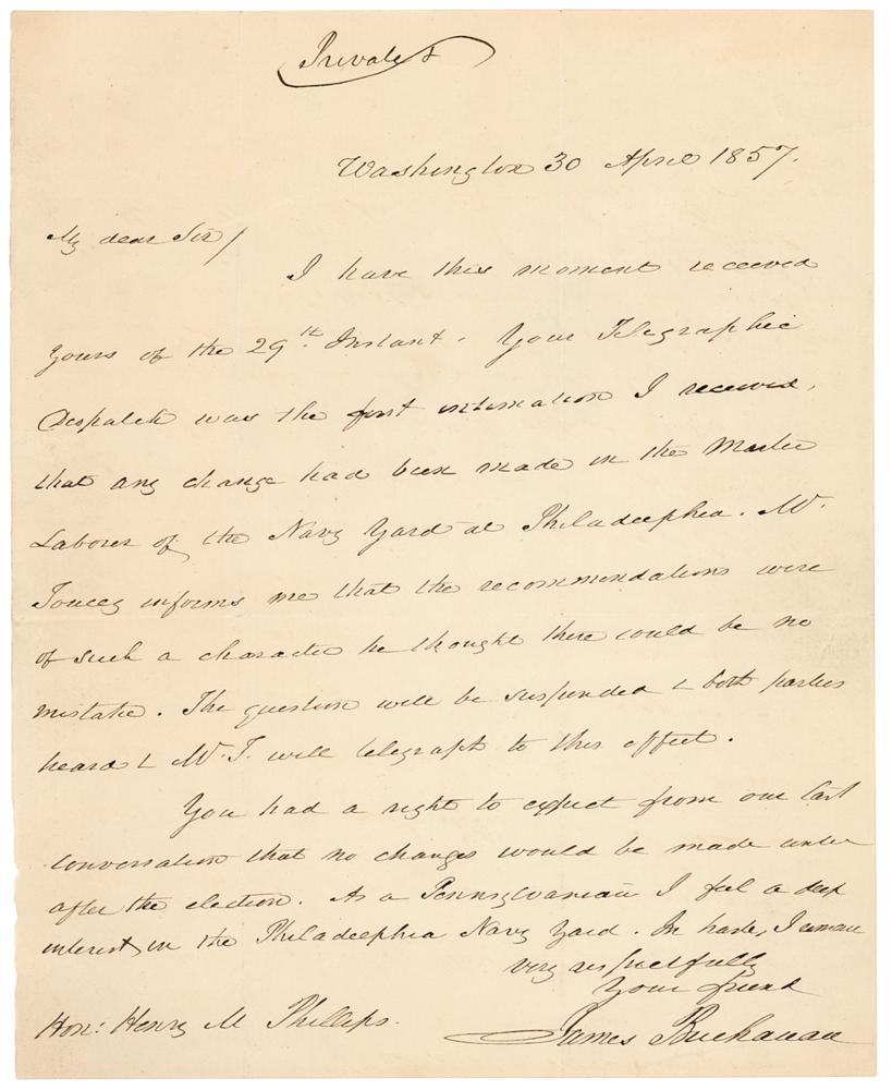 ALS as president, one page, 7 x 8.75, April 30, 1857. Handwritten letter to Hon. Henry M. Phillips, a Democratic member of the U.S. House of Representatives from Pennsylvania. In full: "I have this moment received yours of the 29th Instant. Your Telegraphic Dispatch was the first intimation I received that any change had been made in the Master Laborer of the Navy Yard at Philadelphia. Mr. Jones informs me that the recommendations were of such a character he thought there could be no mistake. The question will be suspended & both parties heard?You had a right to expect from our last conversation that no changes would be made until after the election. As a Pennsylvanian I feel a deep interest in the Philadelphia Navy Yard." In fine condition.