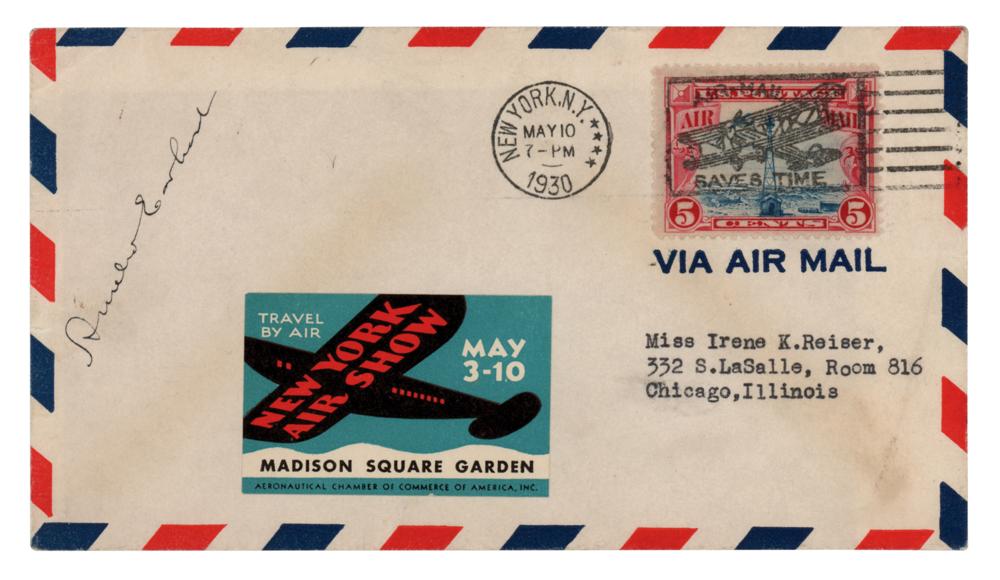 Attractive airmail cover with affixed label honoring the 1930 New York Air Show at Madison Square Garden, neatly signed in fountain pen by Amelia Earhart. In fine condition.
