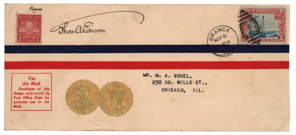 Commemorative cover the 50th anniversary of Edison's first incandescent electric light, with affixed 2¢ postage stamp and 'golden jubilee' emblems, boldly signed in fountain pen, "Thos. A. Edison." In fine condition, with light soiling and handling wear.