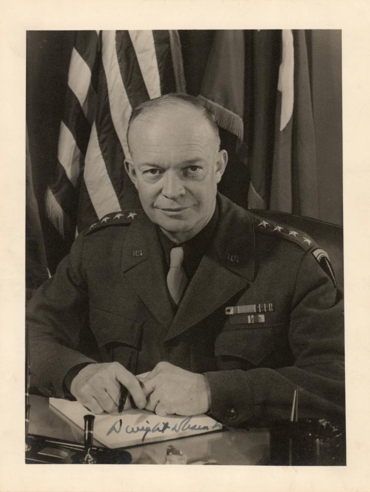 World War II-era matte-finish 6.5 x 8.5 photo of Dwight D. Eisenhower in his four-star general's uniform, neatly signed in fountain pen. Stamped on the reverse with a U.S. Army Pictorial Service credit and censor stamp. In very good to fine condition, with a horizontal bend passing across Eisenhower's face.