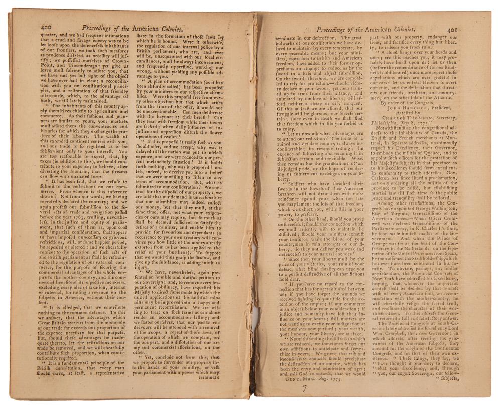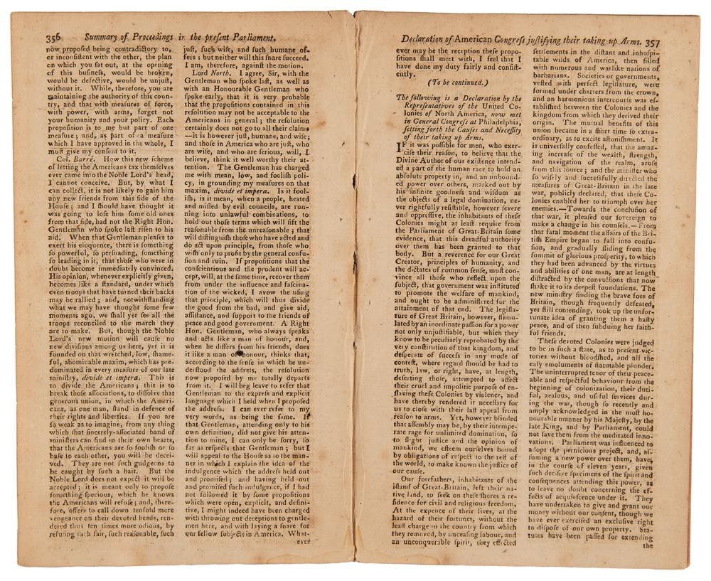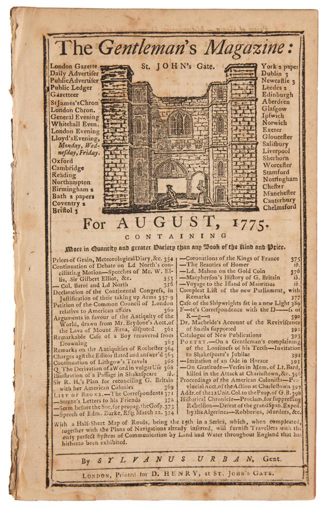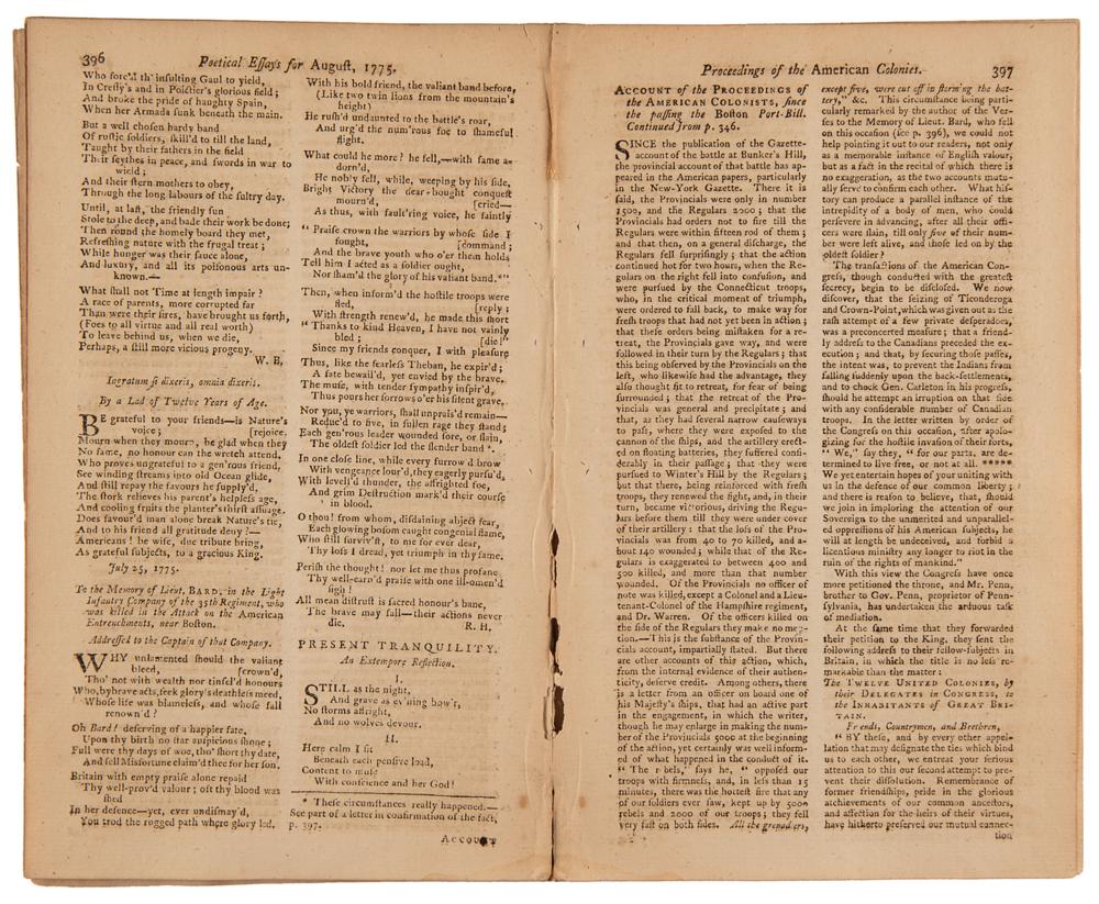 Complete issue of The Gentleman's Magazine from August 1775, 5.25 x 8.25, printed in London by Sylvanus Urban. The periodical contains several significant texts related to the Revolutionary War: the 'Declaration of the Causes and Necessity of Taking Up Arms,' adopted by the Second Continental Congress on July 6, 1775; reporting on the Battle of Bunker Hill, including a memorial poem dedicated to Lieutenant Bard of the 35th Regiment, who was killed; and a piece announcing that "the Congress have appointed George Washington, Esq. of Virginia, Generalissimo of the American forces." Disbound from a larger volume and in very good condition, with separation to several of the later pages at the spine.