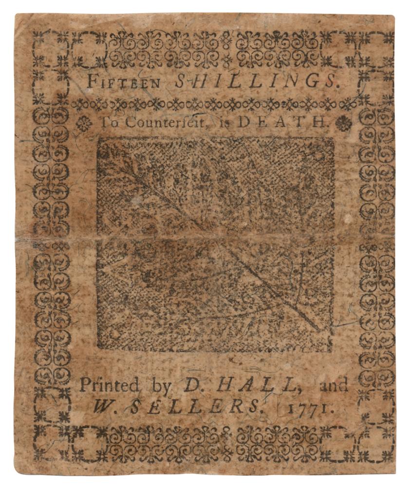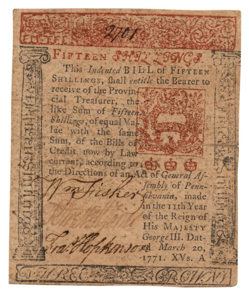 Signer of the Declaration of Independence from New Jersey (1737-1791) who is also known as the designer of the first official American flag. Colonial Pennsylvania engraved bank note for "Fifteen Shillings," signed “Fra’s Hopkinson,” 3 x 3.5, issued as No. 2701, and reading: “This Indented Bill of Fifteen Shillings, shall entitle the Bearer to receive of the Provincial Treasurer, the like Sum of Fifteen Shillings, of equal Value with the same Sum, of the Bills of Credit now by law current, according to the Directions of an Act of General Assembly of Pennsylvania, made in the 11th Year of the Reign of his Majesty Geo. III. Dated March 20, 1771.” Signed at the conclusion by Francis Hopkinson, and countersigned by William Fisher. Printed by David Hall and William Sellers, with reverse bearing the cautionary message: "To Counterfeit is Death." In fine condition, with soiling and light handling wear.