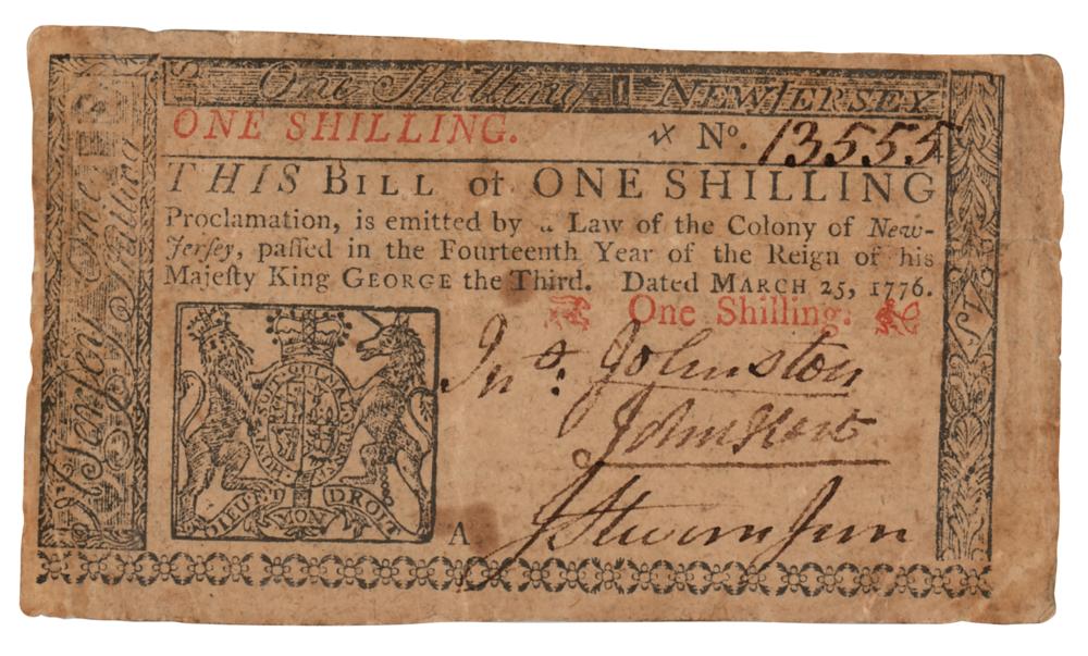 Signer of the Declaration of Independence from New Jersey (1713-1779). Revolutionary War-dated Colonial New Jersey engraved bank note for "One Shilling," 4.25 x 2.25, issued as No. 13555, and reading: “This Bill of One Shilling Proclamation, is emitted by a Law of the Colony of New-Jersey, passed in the Fourteenth Year of the Reign of his Majesty King George the Third. Dated March 25, 1776.” Signed at the conclusion by John Hart, and countersigned by John Johnston and John Stevens, Jr. Printed in Burlington, New Jersey by Isaac Collins, with reverse bearing the cautionary message: "'Tis Death to Counterfeit." In fine condition, with soiling and light handling wear.