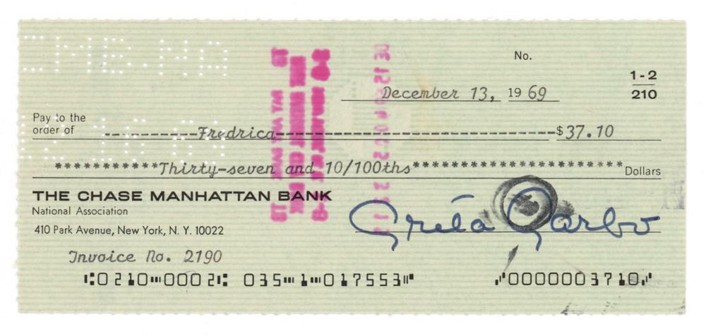 Chase Manhattan Bank check, 6.25 x 2.75, filled out in type and signed by Garbo, "Greta Garbo," payable to New York fashion store Fredrica for $37.10, December 13, 1969. In fine condition.