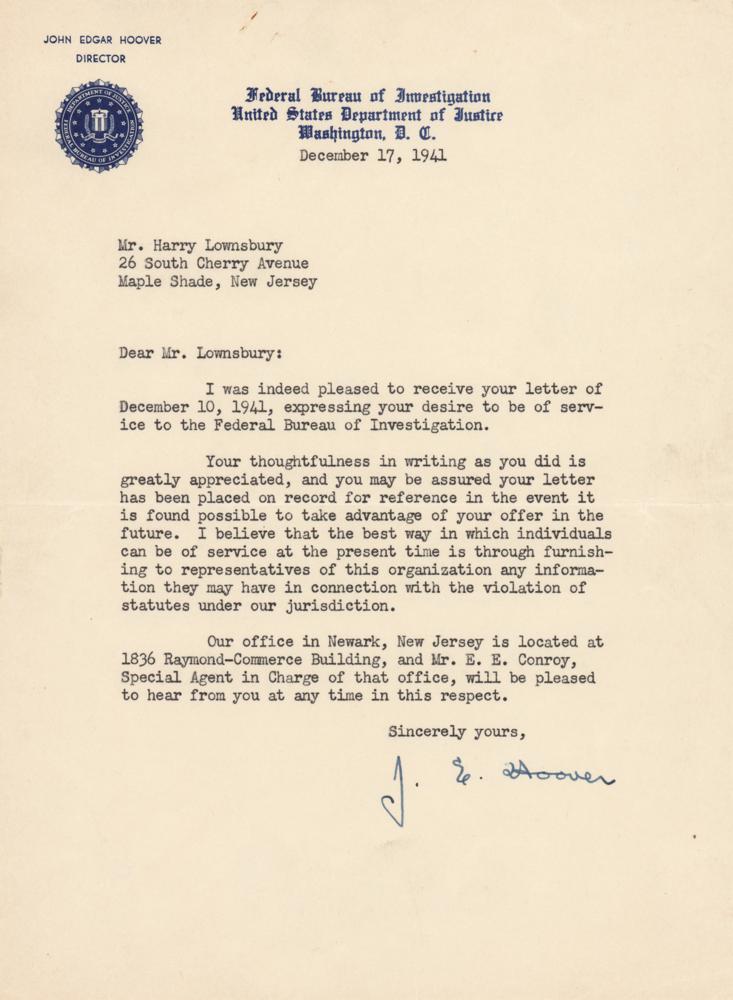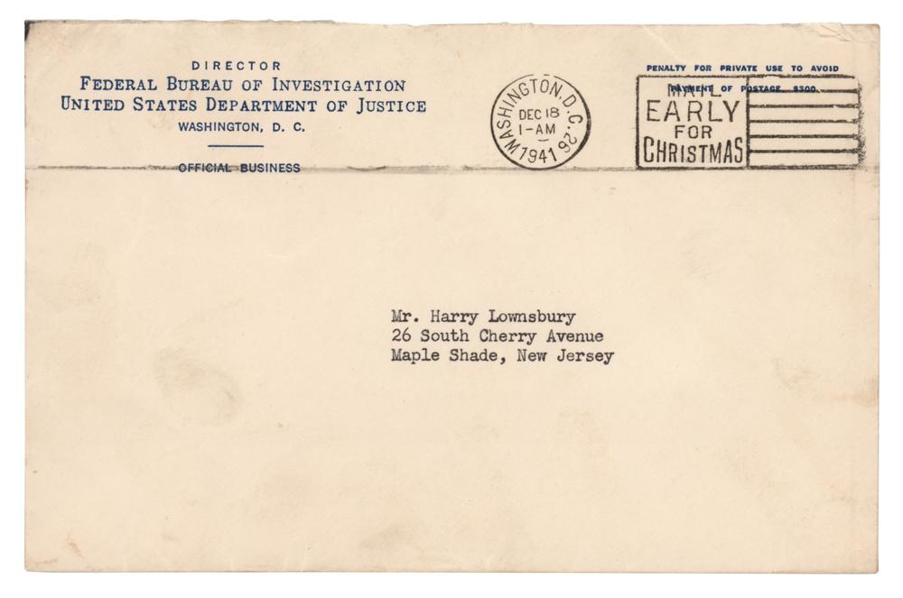 TLS, one page, 7 x 9.25, Federal Bureau of Investigation letterhead, December 17, 1941. Letter to Harry Lownsbury, in part: "I was indeed pleased to receive your letter of December 10, 1941, expressing your desire to be of service to the Federal Bureau of Investigation?Your letter has been placed on record for reference in the event it is found possible to take advantage of your offer in the future. I believe that the best was in which individuals can be of service at the present time is through furnishing to representatives of this organization any information they may have in connection with the violation of statutes under our jurisdiction." In fine condition. Accompanied by the original mailing envelope.