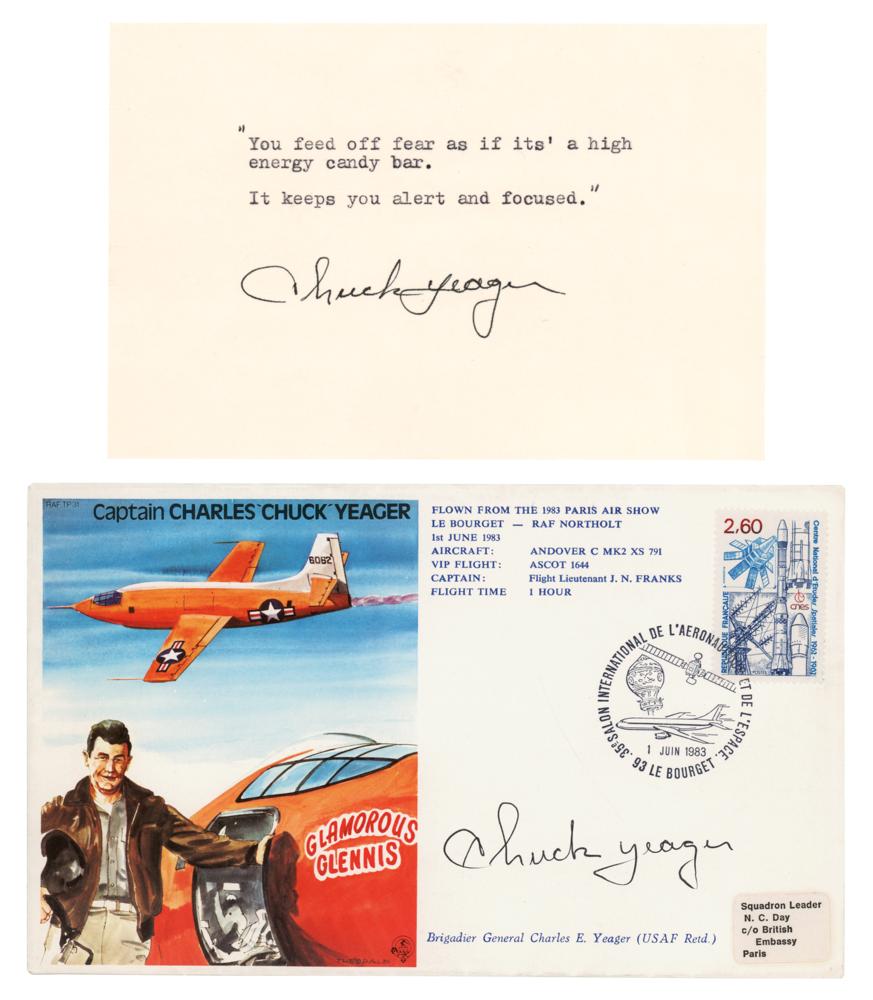 Two items signed by Chuck Yeager: a limited edition cover from the 1983 Paris Air Show, numbered 9/1000, signed in black ink; and an ink signature, "Chuck Yeager," on an off-white 6 x 4 card, featuring a quote: "You feed off fear as if it's a high energy candy bar. It keeps you alert and focused." In very fine condition.