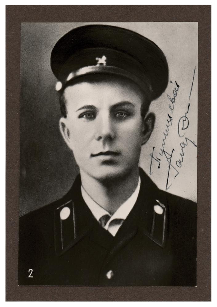 Vintage glossy 2.75 x 3.75 portrait photo of a young Yuri Gagarin early in his career with the Soviet Air Force, signed vertically in Cyrillic black ink. Affixed to a slightly larger mount and in fine condition.